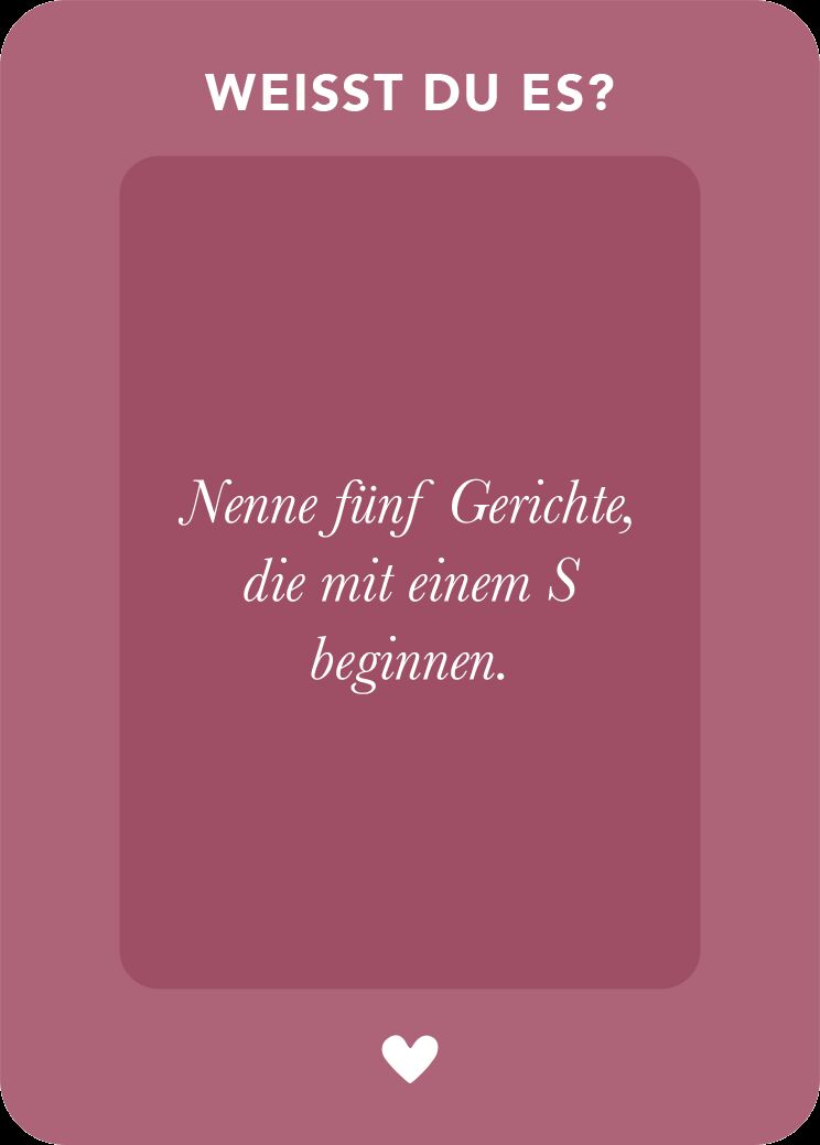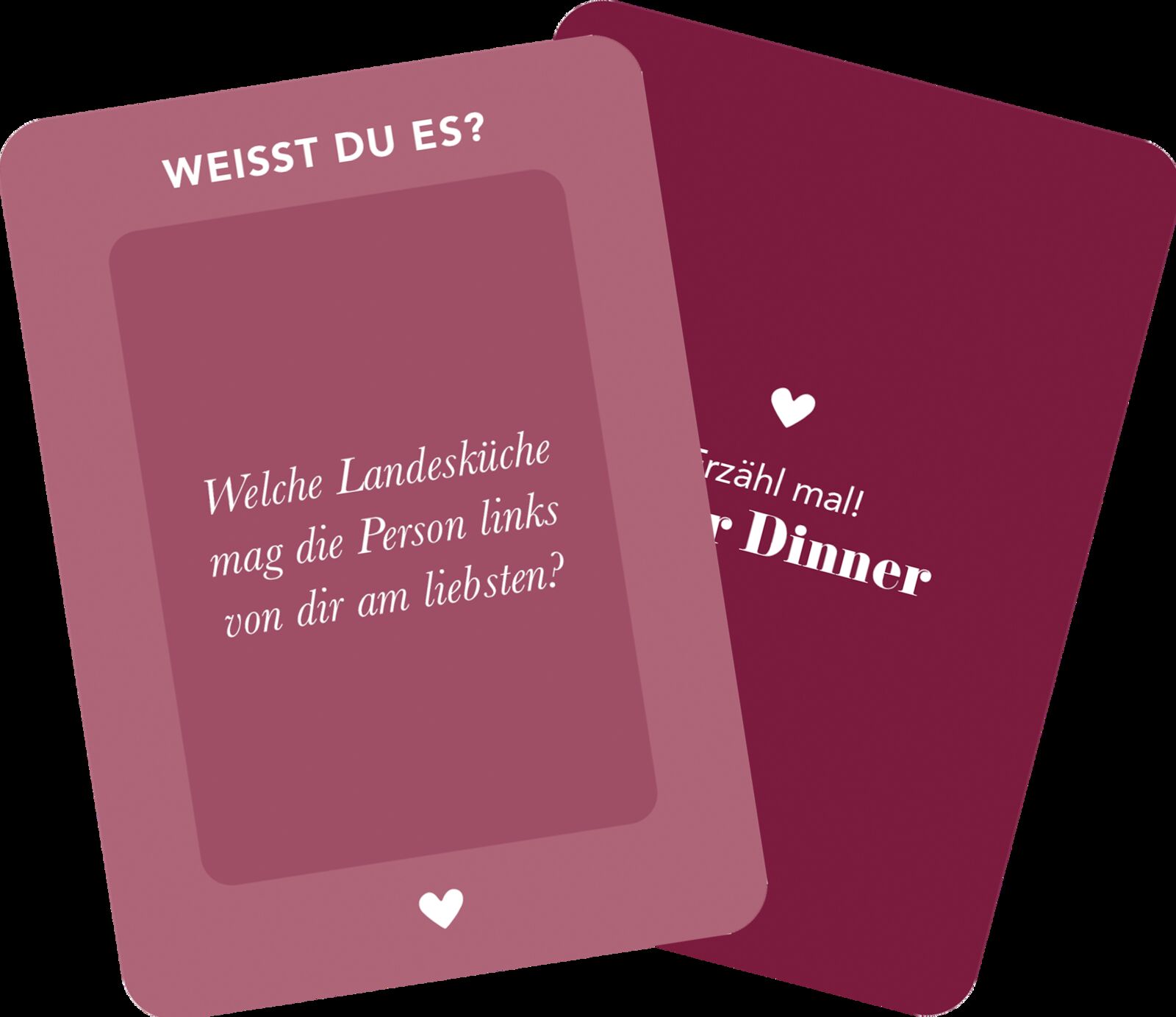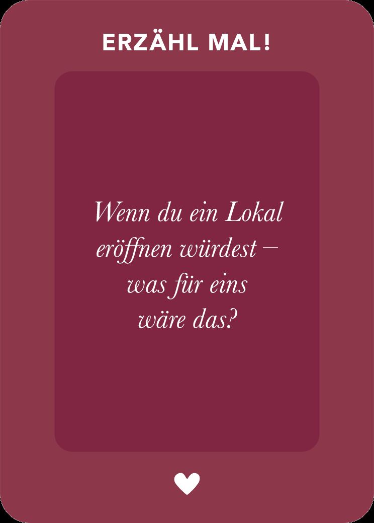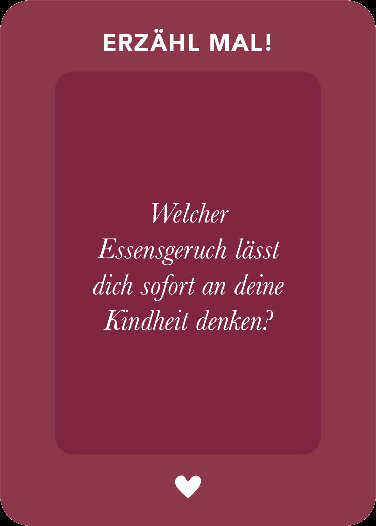 Unterhaltsames Fragespiel für Freunde und Familie zu den Themen Essen und Trinken Welcher Essensduft lässt dich an deine Kindheit denken? Was ist der romantischste Ort, an dem du je gegessen hast? Was bestellt James Bond am liebsten zu trinken? »Erzähl mal! A...