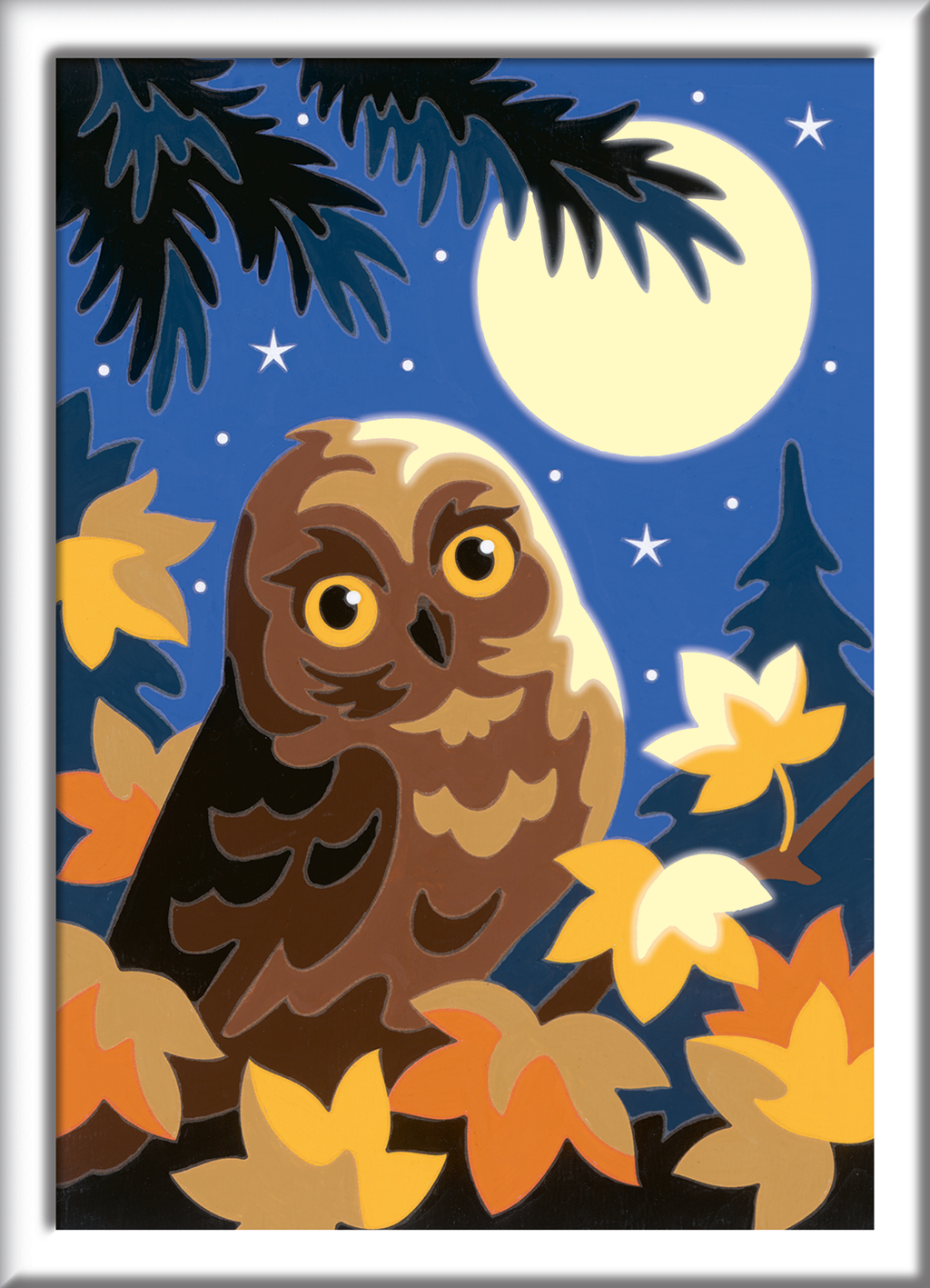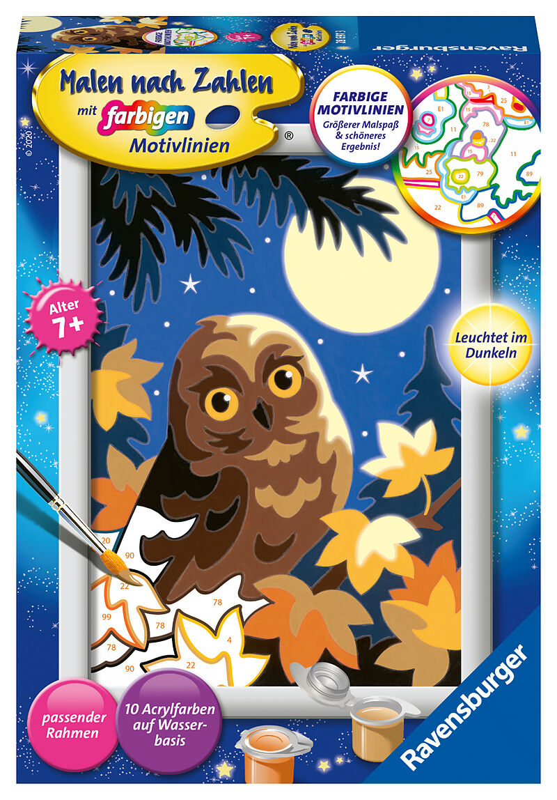 Dieses Komplettset enthält eine Maltafel mit Malfeldern in altersgerechter Grösse, Acrylfarben in wiederverschliessbaren Näpfchen, einen Qualitätspinsel und einen passenden, hochwertigen Bilderrahmen. Das Bild leuchtet im Dunkeln.