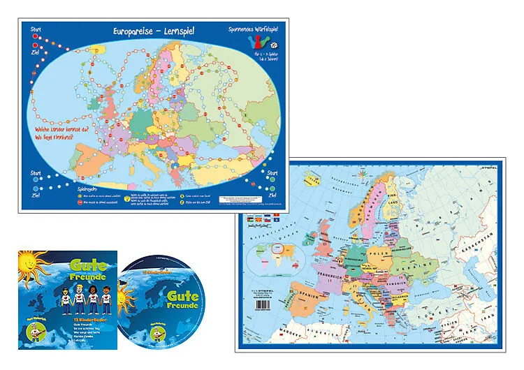 Weltreise-Würfelspiel mit Musik-CD Titelbeschreibung - Tischset - beidseitig bedruckt - eingeschweißt - mit Würfel und Spielfiguren für zwei bis drei Spieler - inkl. Musik-CD mit 12 Kinderliedern in Deutsch - verpackt im wiederverschließbaren Klappenbeutel - f...