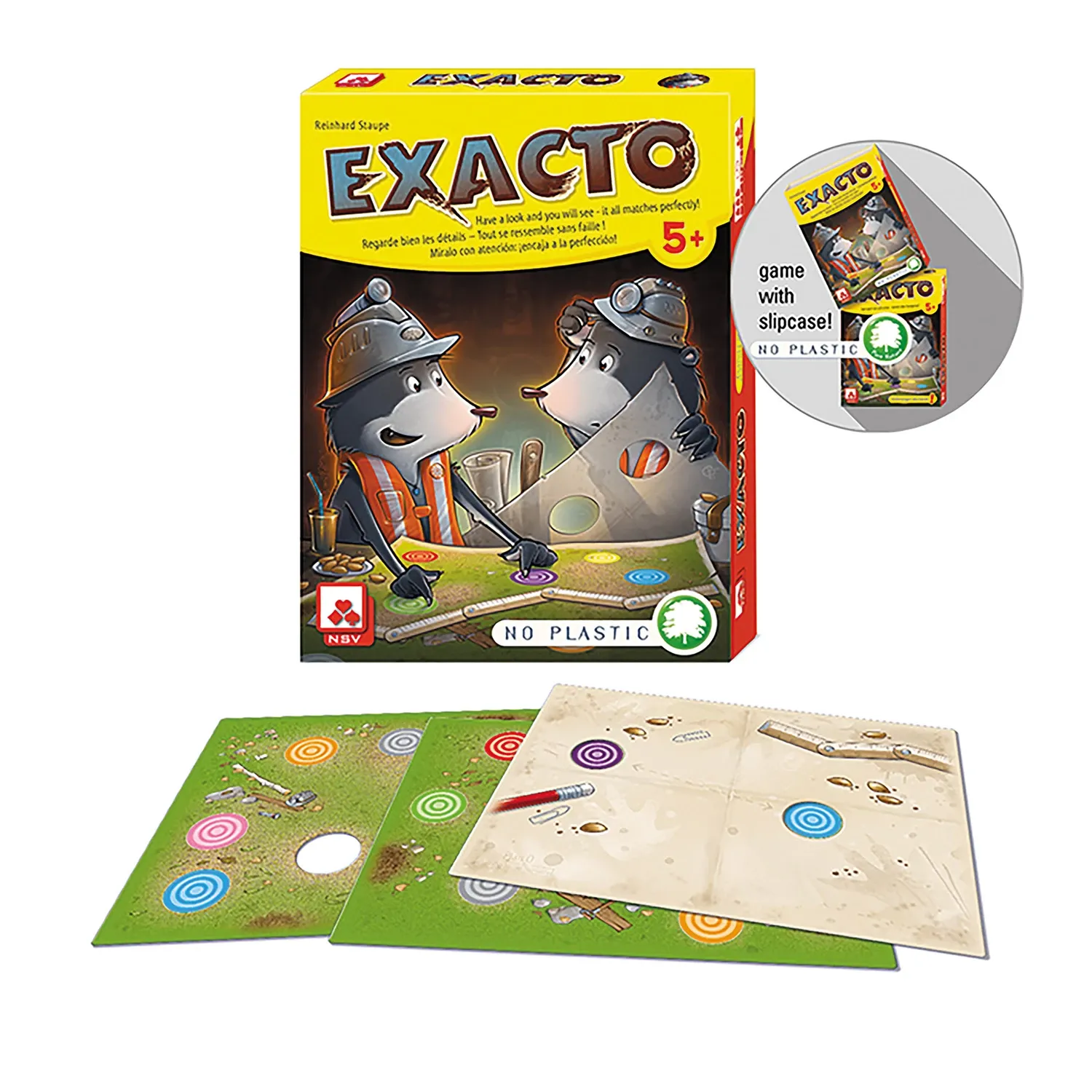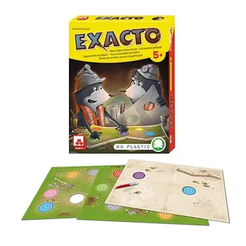 Wer kann Abstände besser einschätzen Kinder oder Erwachsene? In jede Tafel sind zwei Löcher eingestanzt und genau zwei Farbkreise auf jeder der 15 Landkarten haben exakt diese Entfernung. Aber welche? EXACTO ist verblüffend einfach. Und einfach genial!