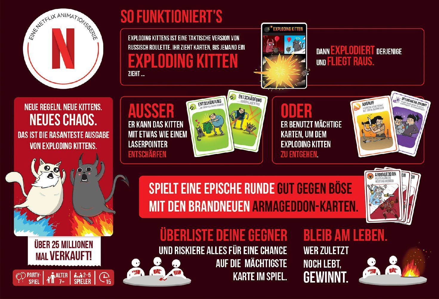 Die eigenständige Version Exploding Kittens: Good vs. Evil zur gleichnamigen Netflix-Animationsserie nimmt die Spieler mit in den ultimativen Wettstreit zwischen Gut und Böse und explodierenden Kätzchen. Für eine Chance auf die mächtigste Karte im Spiel lösen ...