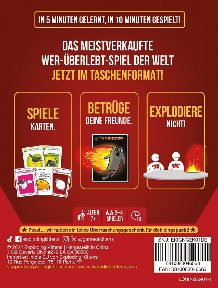 Exploding Kittens Grab & Game Mit Exploding Kittens: Grab & Game kommt euer liebstes explosionsstarkes Katzen-Partyspiel im Taschenformat, damit ihr es überallhin mitnehmen und liebhaben könnt. Wer Exploding Kittens kennt und ein Fan ist, der weiß, wie es funk...