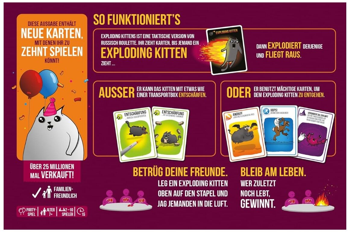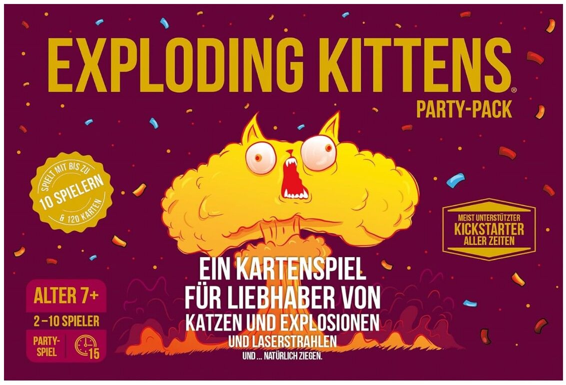 Exploding Kittens Party-Pack Der erfolgreiche Kickstarter jetzt als Party-Pack! Für jeden Exploding Kittens-Fan ein Must-have. Das Exploding Kittens Party-Pack enthält ausgewählte Karten des Grundspiels Exploding Kittens und der Erweiterung Imploding Kittens. ...