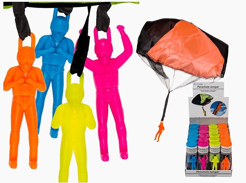 Eines der unvergesslichen Spielzeuge der 80er! Geöffnet ca. 51 cm. Springer und den Fallschirm einfach zusammen- knüllen und möglichst hoch in die Luft werfen. Dann öffnet sich der Fallschirm und der Pilot gleitet ganz langsam und sachte zur Erde zurück. Spiel...