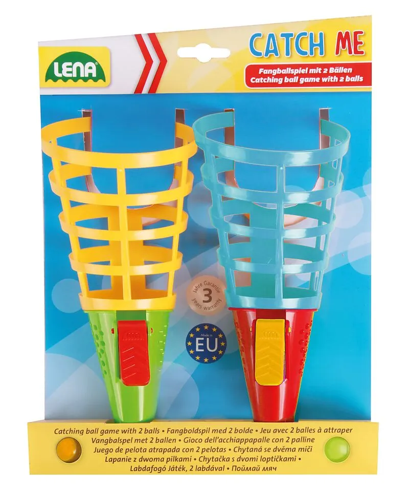 LENA Fangballspiel, Duo-Pack. Fördert Geschicklichkeit und Koordination. Mit großem Fangbecher. Inklusive 2 Bälle. Indoor & Outdoor geeignet für Kinder ab 3 Jahren. Verpackt in buntem Schaukarton. MADE IN EUROPE.
