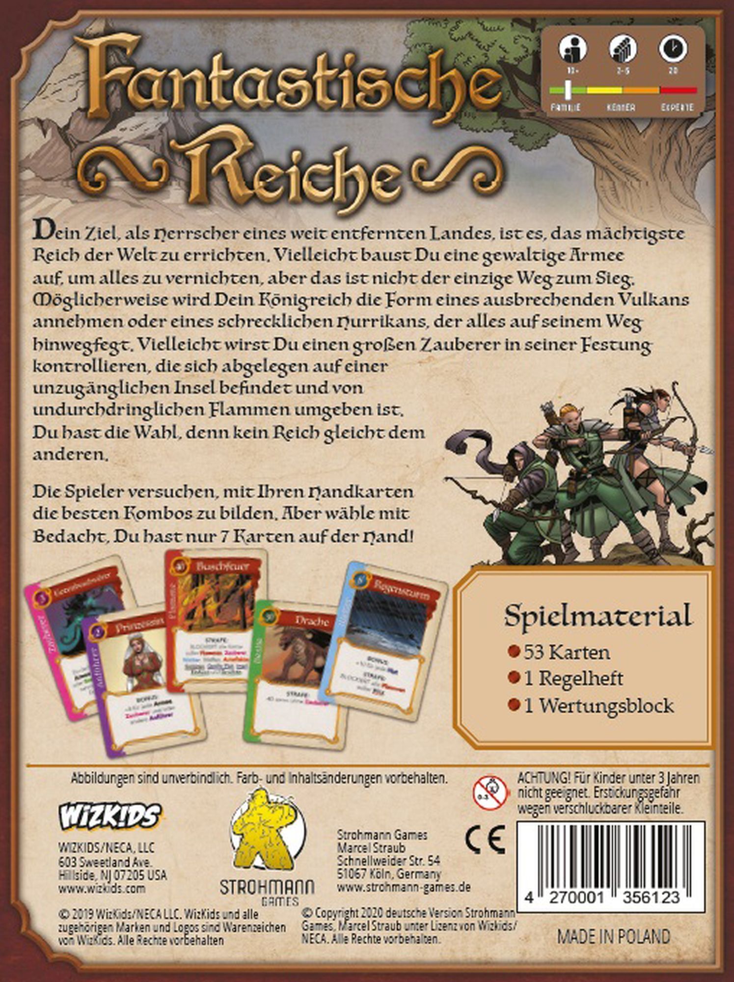 Fantastische Reiche In Fantastische Reiche versuchst Du mit Deiner Kartenhand aus 7 Karten das mächtigste Königreich zu erschaffen. Das Spiel ist einfach zu erlernen (In Deinem Zug nimmst Du eine Karte und legst eine ab), bietet aber durch 53 verschiedene Kart...