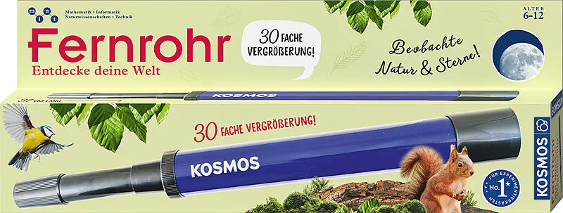 Den Himmel nach Sternenbildern absuchen, die zerfurchte Kraterlandschaft des Mondes erforschen oder Vögel im Wald oder vor dem Fenster beobachten - das Fernrohr von KOSMOS bringt Kindern unerreichbare Welten ganz nah heran. Das Linsenfernrohr mit der 30fachen ...