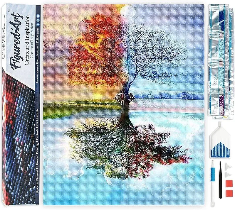 Diamond Painting Set - 4 Jahreszeiten - 5D-Bild, Leinwand mit eckigen Steinen Dieses wunderschöne Diamond-Painting-Set enthält alles, was Sie benötigen, um Ihr Kunstwerk zu erstellen: - Leinwand (gerollt) in 40x50cm, die mit dem zu gestaltenden Motiv bedruckt ...
