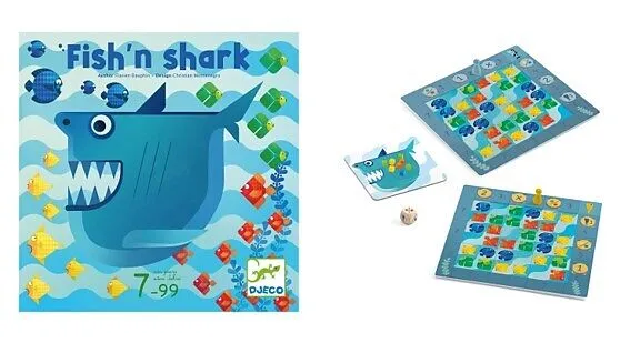 Papa Hai nimmt seine Kinder zu einer Unterrichtsstunde im Fischfang mit. Wer wird der Beste sein? Bei jeder Runde fangen die jungen Haie vier Fische, doch nicht alle können behalten werden. Jeder muss sorgfältig auswählen, um so viele Spielplan-Kästchen wie mö...