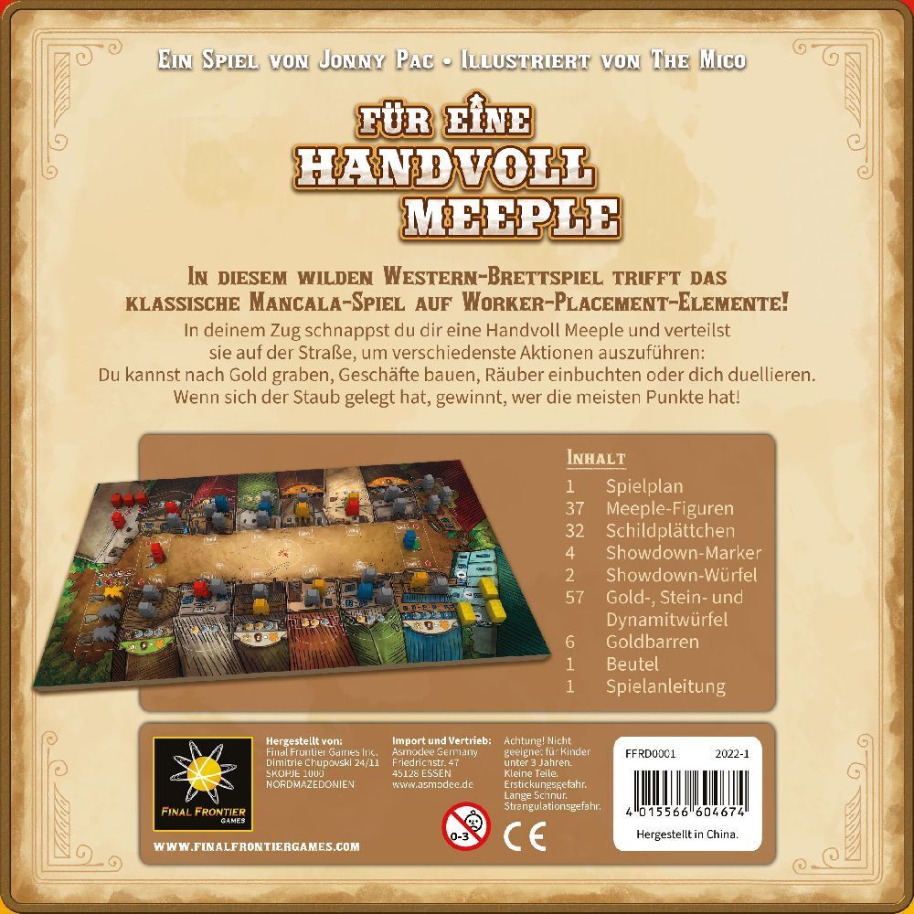 Im Wilden Western-Familienspiel Für eine Handvoll Meeple trifft das klassische Mancala auf Worker-Placement-Elemente. Jede Runde schnappen sich die Spieler eine Handvoll Meeple und verteilen sie auf dem Spielplan, um verschiedenste Aktionen auszuführen: Gold g...