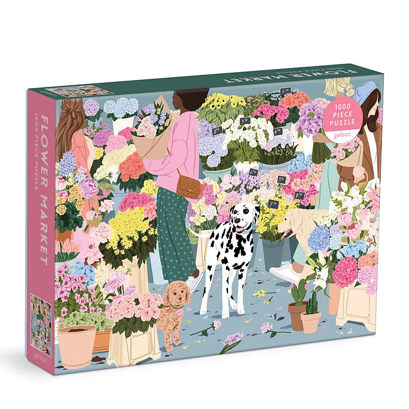 The Flower Market 1000 Piece Puzzle from Galison features a busy outdoor flower market with shoppers, their dogs, including a black and white Dalmatian right in the center of the image. Galison puzzles are packaged in matte-finish sturdy boxes, perfect for gif...