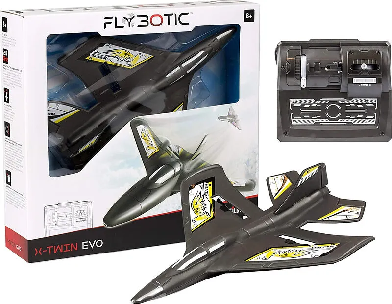 308x250x60 mm. Das X-Twin Evo Flugzeug ist aus haltbarem Material gebaut. 2-Kanal-Kontrolle, 2,4 GHz, Reichweite bis zu 60 m, Ladezeit ca. 40 Minuten, Spielzeit ca. 5 Minuten.