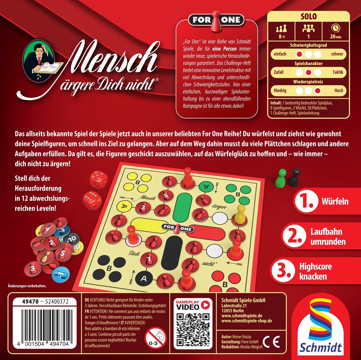 Mensch ärgere Dich nicht® Nun auch als 1-Personen-Variante! Wie in allen anderen Spielen der beliebten FOR ONE Reihe stellt dich die spannende Levelstruktur vor immer wieder neue Aufgaben. Dank der einfachen Grundregeln bietet dieses FOR ONE den perfekten Eins...