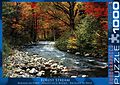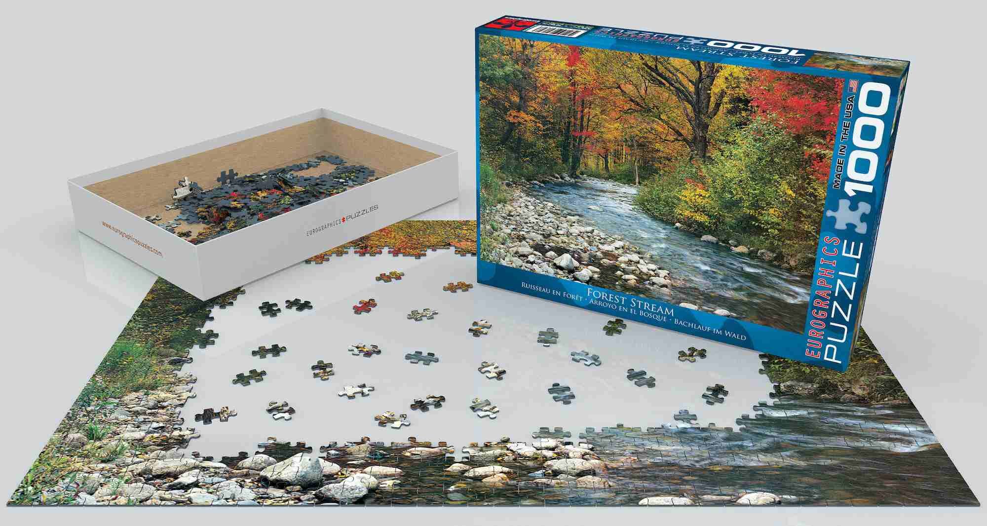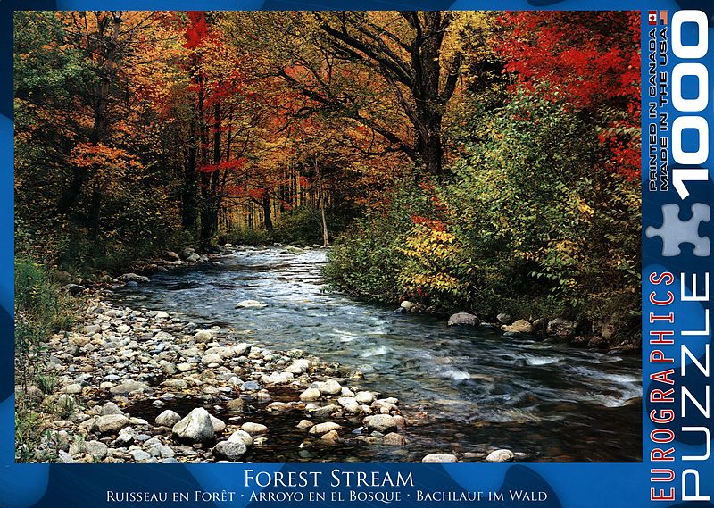 EuroGraphics Bachlauf im Wald 1000-Teile Puzzle. Verpackungsabmessungen 35 x 25 x 6 cm. Abmessungen des zusammengebauten Puzzles 48 x 68 cm. Ein erfrischender Bach fließt langsame durch einen Septemberwald in dem sich schon langsam das Lauf färbt. Geniessen Si...