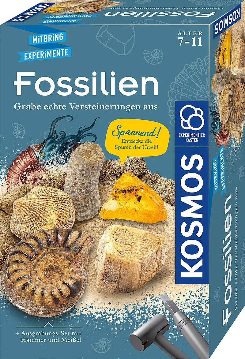 Graben, entdecken, staunen einfach unglaublich, dass sich echte Fossilien, wie Ammonit, Steinkoralle, Atrypa-Schale oder Copal in diesem Gips-Ausgrabungsblock verstecken. Das Experimentierset enthält als Werkzeug Hammer, Meißel und Schwämmchen einfach den Gips...