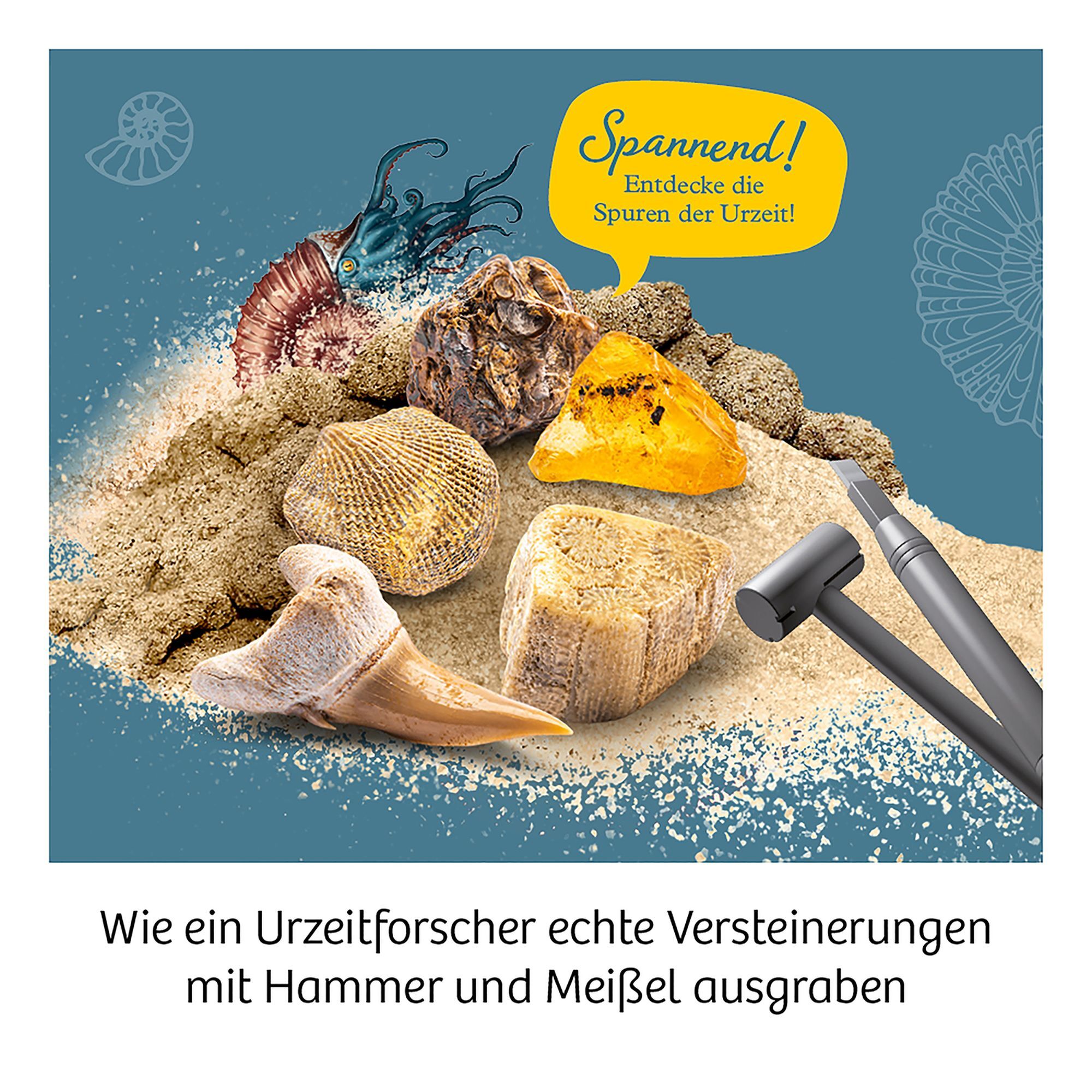 Graben, entdecken, staunen einfach unglaublich, dass sich echte Fossilien, wie Ammonit, Steinkoralle, Atrypa-Schale oder Copal in diesem Gips-Ausgrabungsblock verstecken. Das Experimentierset enthält als Werkzeug Hammer, Meißel und Schwämmchen einfach den Gips...