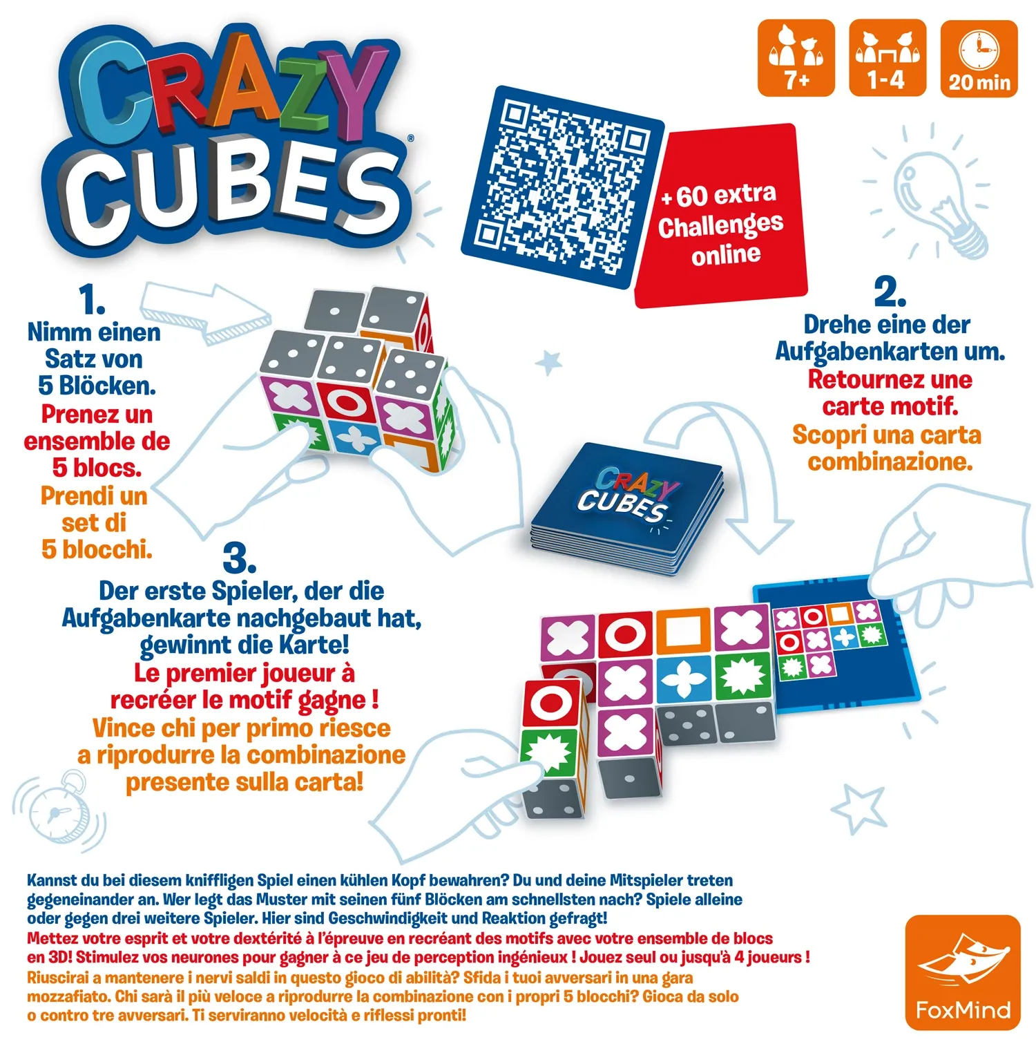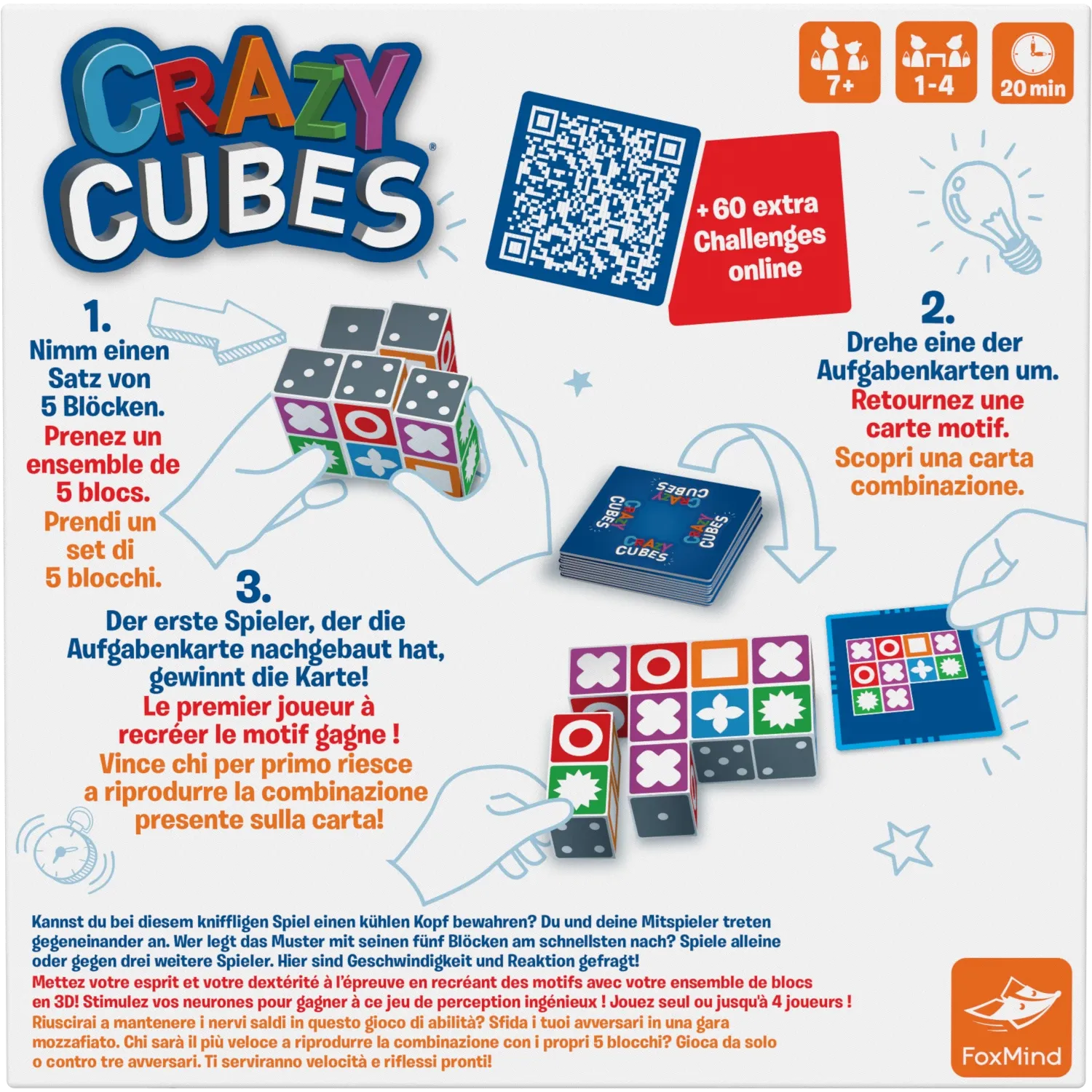 Crazy Cubes ist ein kniffliges Spiel, das mit viel Geschwindigkeit und Wahrnehmung zusammenhängt. Die Spieler müssen ein kühles Köpfchen bewahren, um mit den Spielblöcken das richtige Muster zu legen. Alle Mitspieler treten gegeneinander an. Welcher Spieler le...