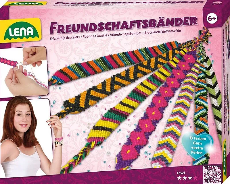 Freundschaftsbänder, groß LENA® Freundschaftsbänder, großes Knüpfset mit Garn in 13verschiedenen Farben sowie vielen bunten Perlen. Geeignet fürKinder ab 6 Jahren. Ausführliche Anleitung mit 200 Illustrationenenthalten.Modellen ent-halten. Verpackt in Faltscha...