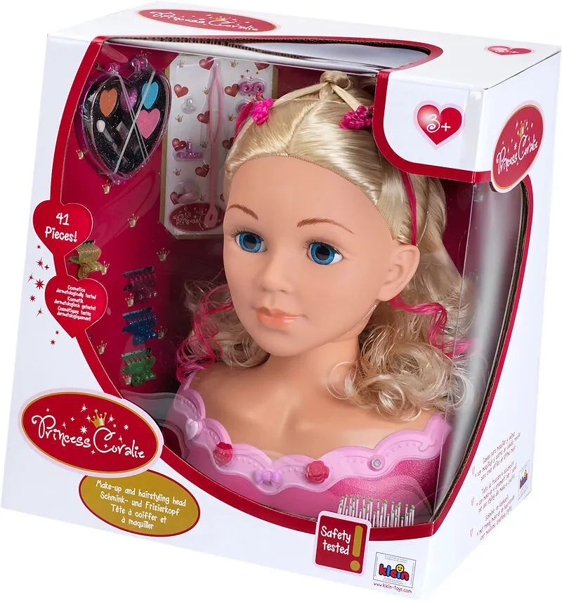 Frisierkopf mit wasch- und kämmbarem Haar. Kosmetikset (dermatologisch getestet) mit Lip- gloss, Lidschatten und Rouge. Bürste und Kamm mit Haarperlenset, 2 Haarsträhnen, 7 Haarclips, 2 Barette Clips. 8 Deko Pins, Sticker und Tipps.