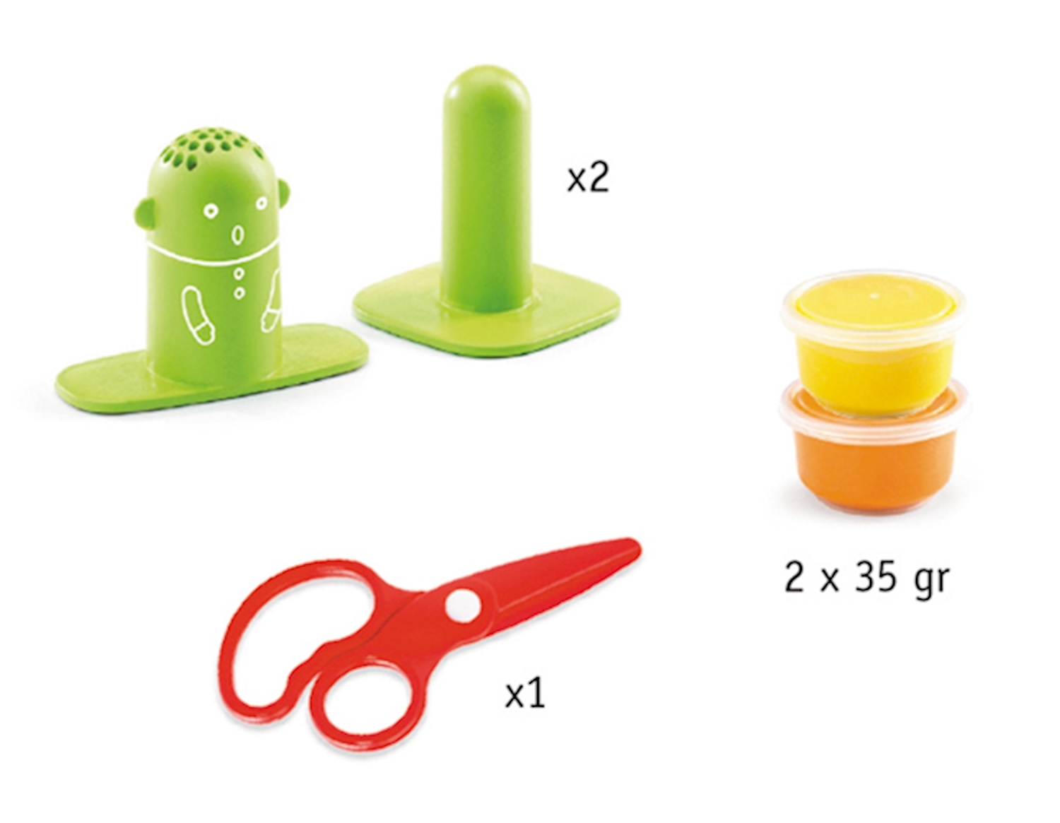 Das Set enthält 3 Knetwerkzeuge/Förmchen und 2 Kneten.