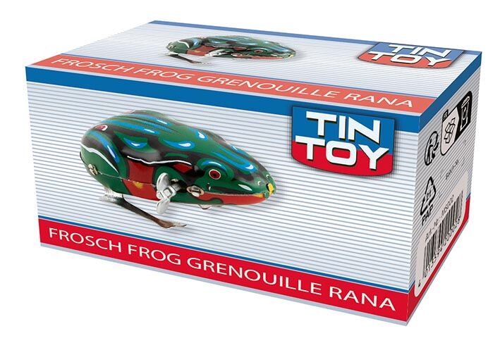 Ein Klassiker! Einmal aufgezogen hüpft der Frosch munter drauf los.