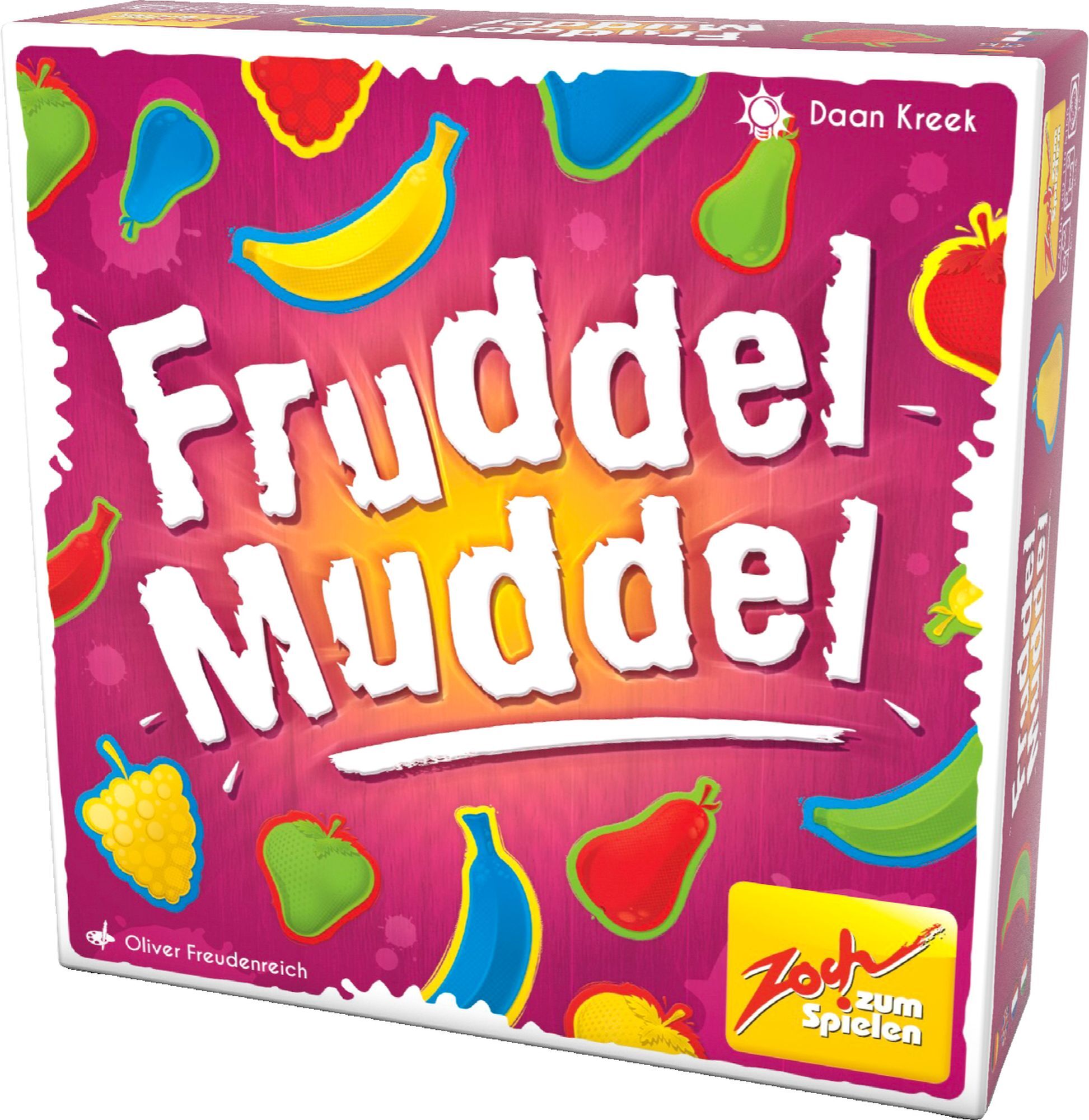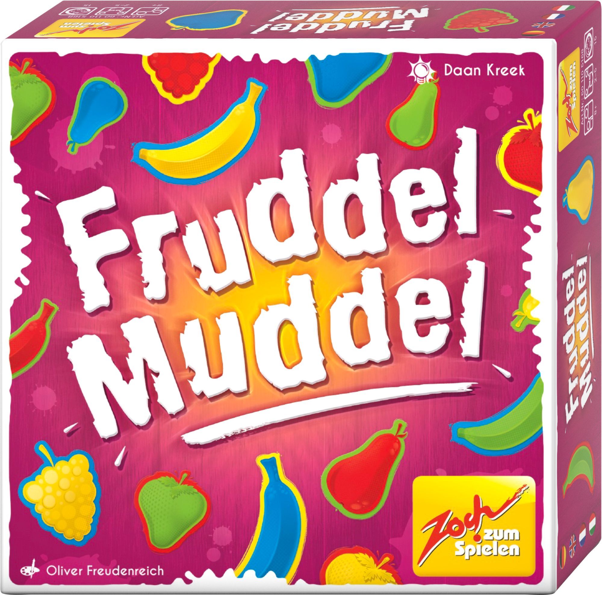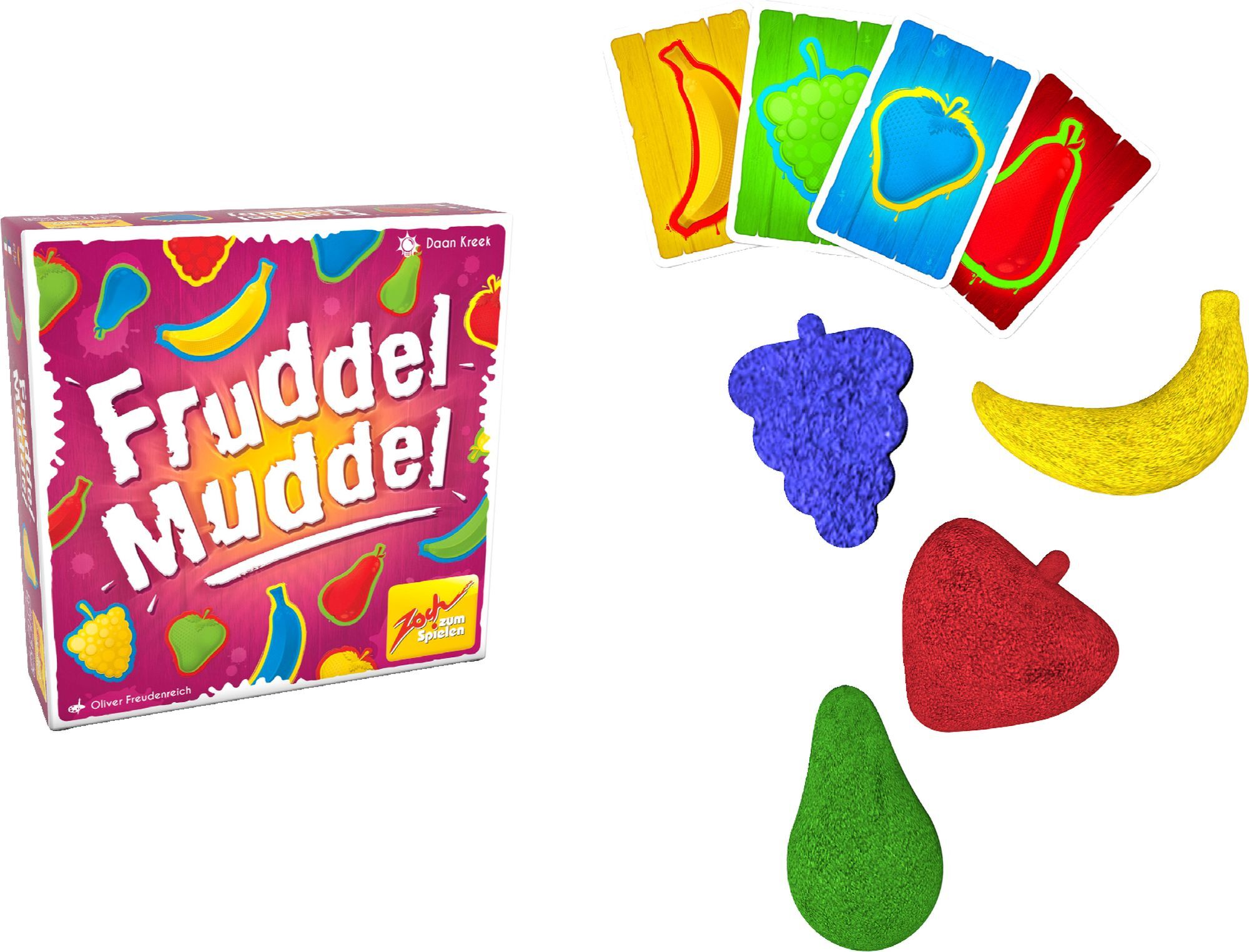 Fruddel Muddel In der Tischmitte warten vier Früchte aus gepolstertem Stoff darauf von den Spielern geschnappt zu werden. Aber welche ist die Richtige? Zeitgleich decken alle Spieler eine Spielkarte auf, die farbverschlüsselt drei Früchte zeigt, obwohl auf den...