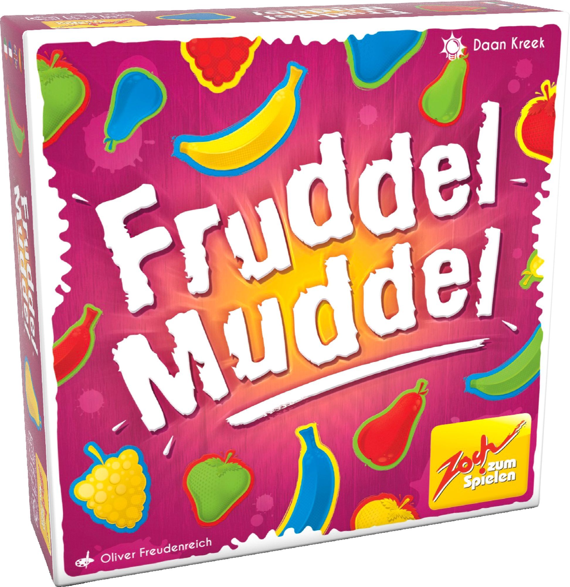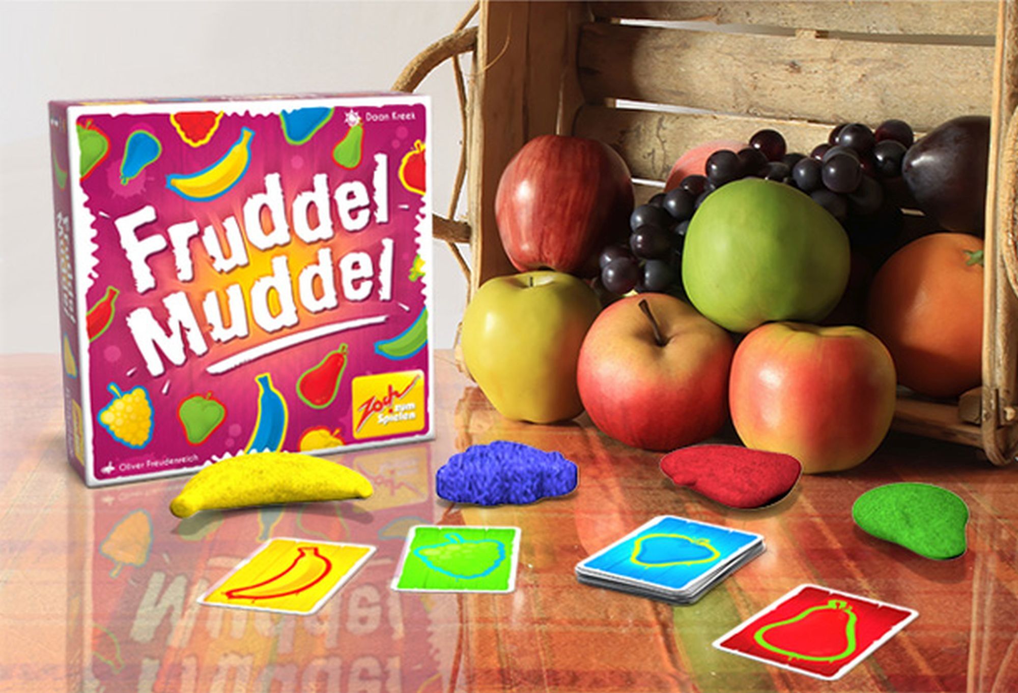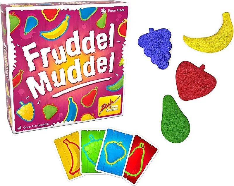 Fruddel Muddel In der Tischmitte warten vier Früchte aus gepolstertem Stoff darauf von den Spielern geschnappt zu werden. Aber welche ist die Richtige? Zeitgleich decken alle Spieler eine Spielkarte auf, die farbverschlüsselt drei Früchte zeigt, obwohl auf den...