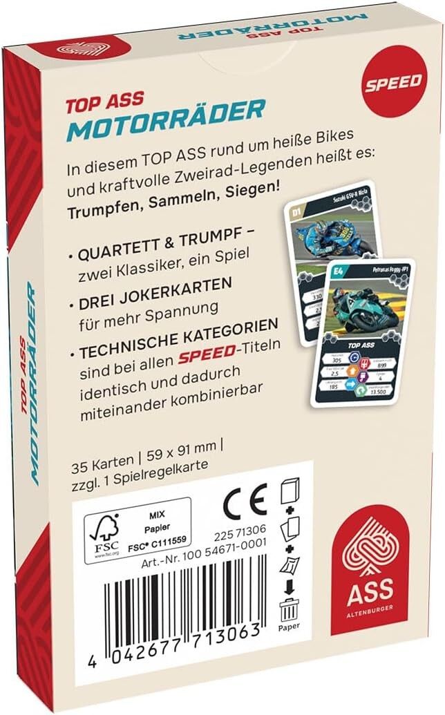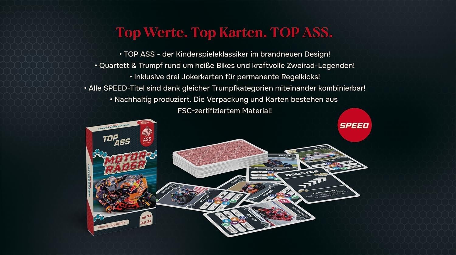 n diesem TOP ASS rund um heiße Bikes and kraftvolle Zweirad-Legenden heißt es: Trumpfen, Sammeln, Siegen! Quartett & Trumpf: zwei Klassiker, ein Spiel! Drei Jokerkarten für mehr Spannung enthalten! Technische Kategorien sind bei allen SPEED-Titeln identisch un...