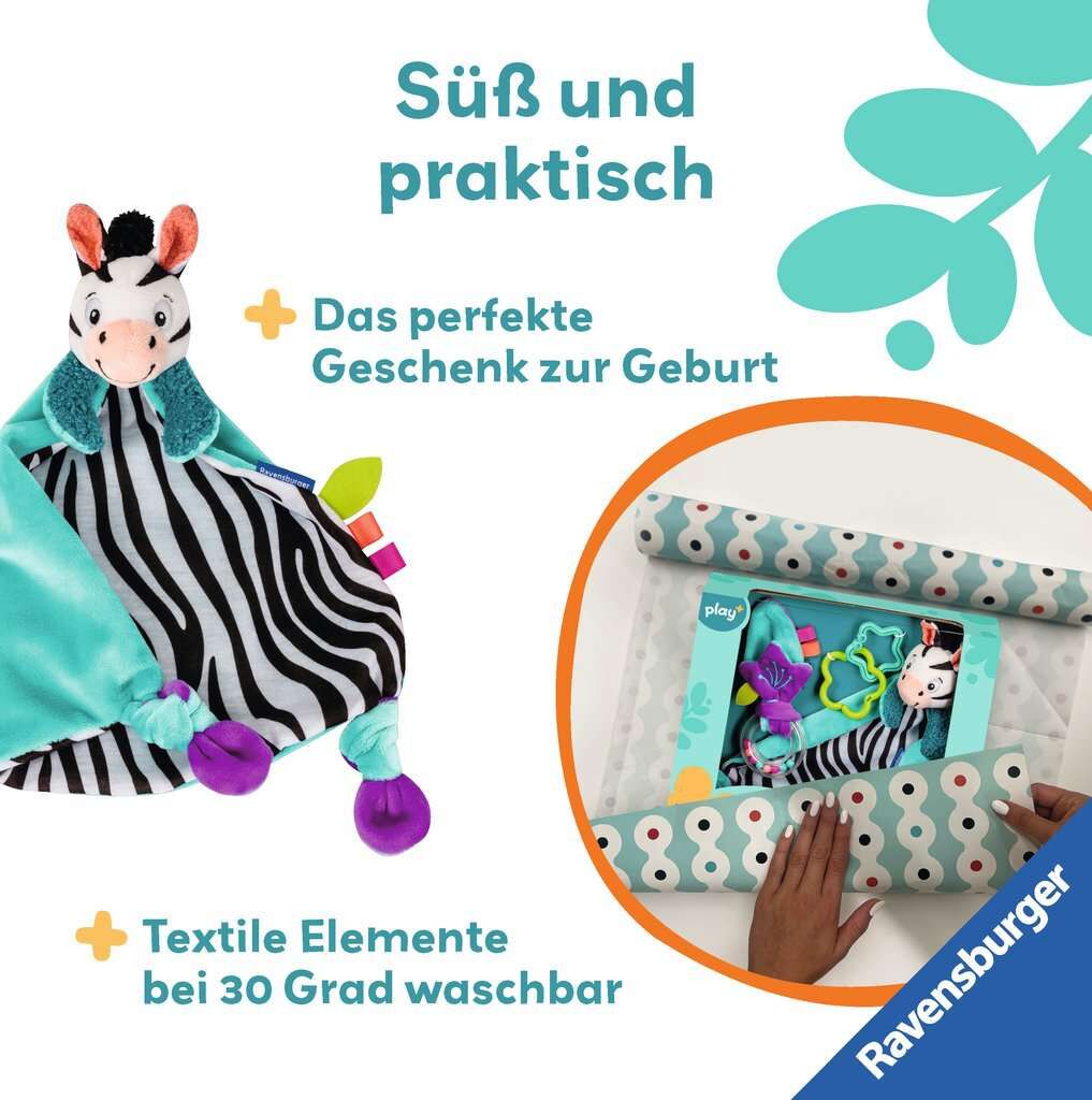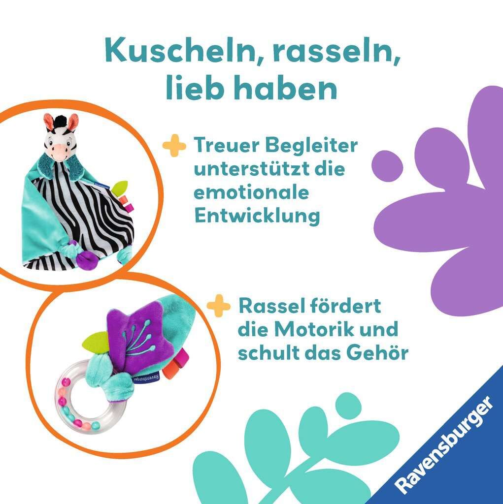 Dieses Geschenk-Set bietet allererste Spielzeuge für Babys. Ein kuschelweiches Schmuse-Zebra mit kontrastreichen Mustern lädt zum Kuscheln ein und stimuliert das Sehen und Fühlen. Eine bunte Ringrassel mit lustigen Stoff-Blättern animiert zum Greifen und Rasse...