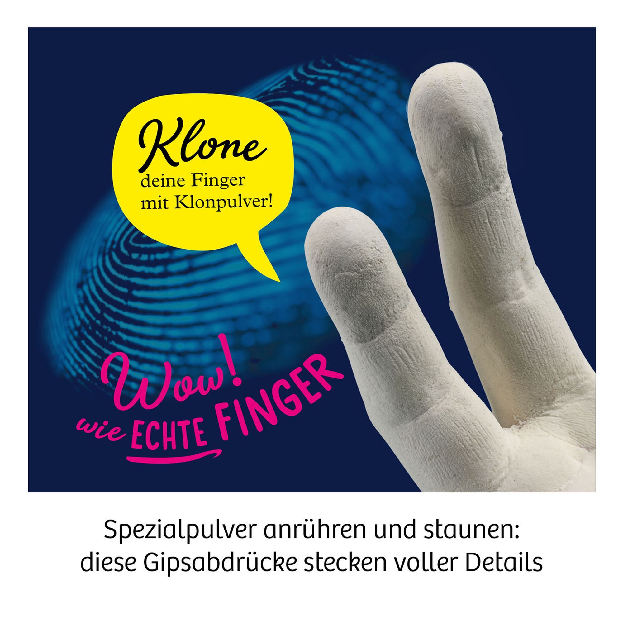 Fun Science 3D-Fingerabdrücke Mit diesem Abdruck-Set werden aus den eigenen Fingern kleine Skulpturen oder sogar ganz persönliche Kettenanhänger! Das Geheimnis lautet: Klon-Pulver. Richtig angemischt wird es zwar fest, bleibt aber elastisch genug, um die einge...