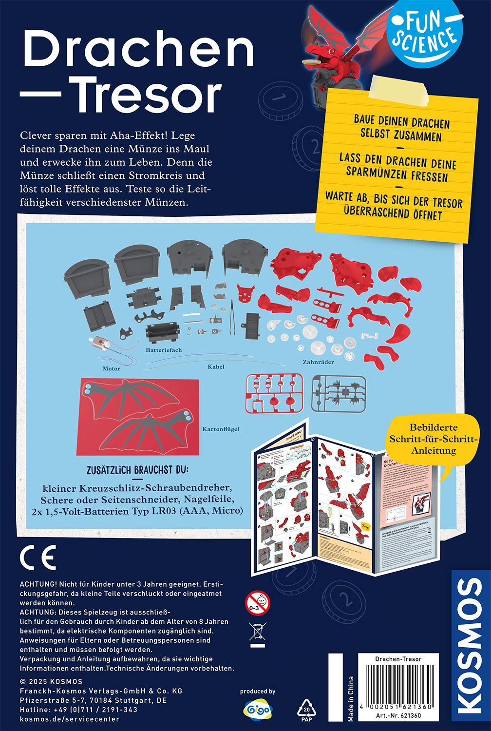 Deine elektronische Spardose mit Wow-Effekt - Wer traut sich, dem Drachen eine Münze ins Maul zu legen?! Es lohnt sich, denn dank eines cleveren Mechanismus befördert der Drache das Geld ins Innere des Tresors und bewegt seine Flügel. - Hat der Drache genügend...
