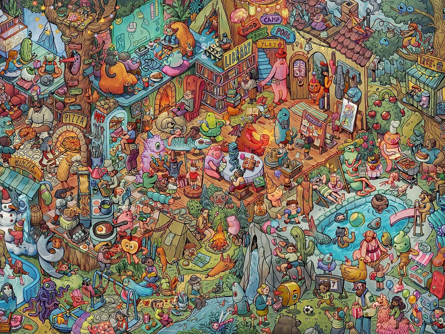 Ein neuer Stern am Wimmel-Himmel! Marija Tiurinas Bilder sind nicht nur voller kleiner Stories, Gestalten und Details, sondern auch noch äußerst stilsicher umgesetzt! Gelegte Größe: 80x60 cm.