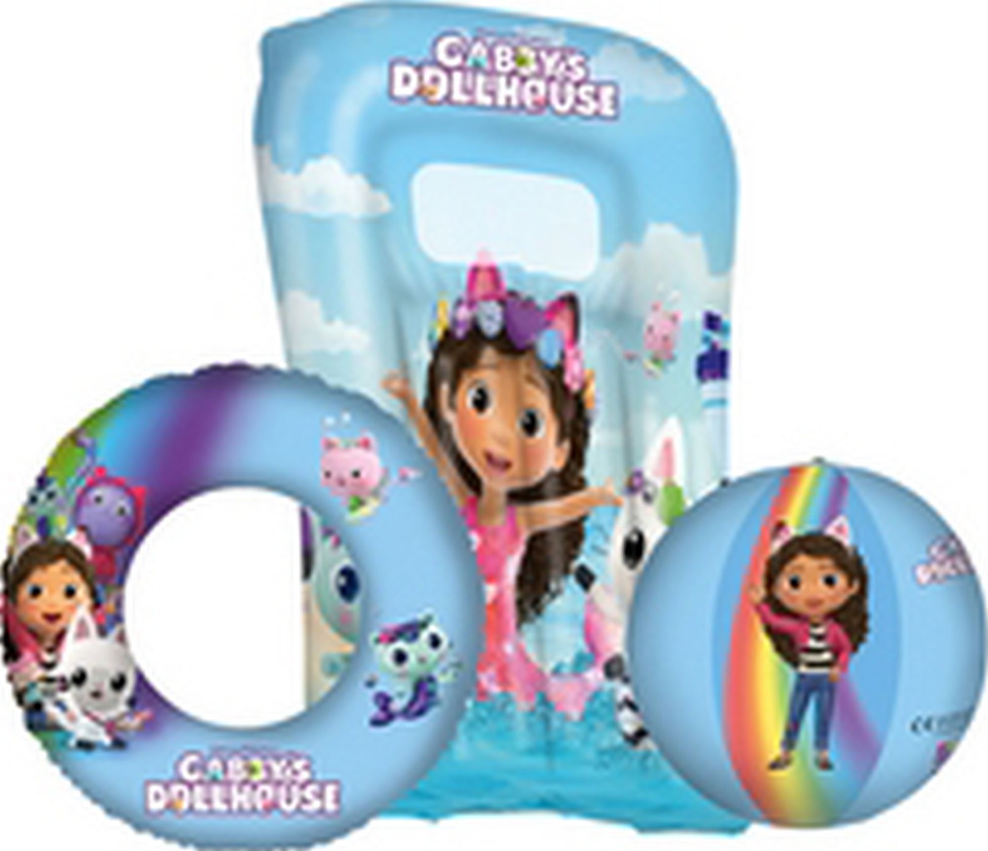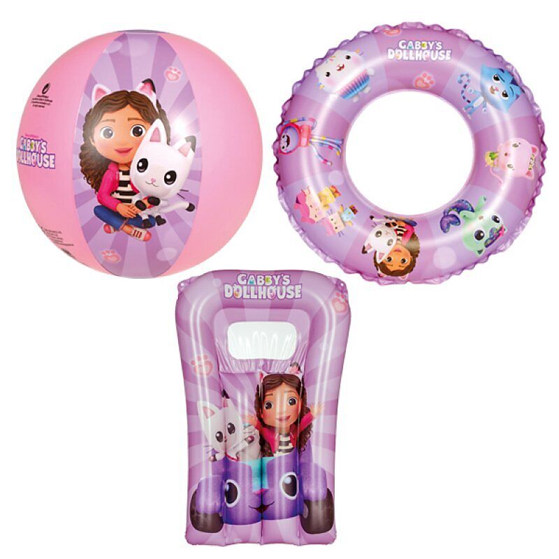 Aufblasartikel-Set im Design von Gabby's Dollhouse bestehend aus 1 Schwimmring ca. 45 cm, 1 Kindermatratze ca. 67x43 cm und 1 Strandball ca. 29 cm