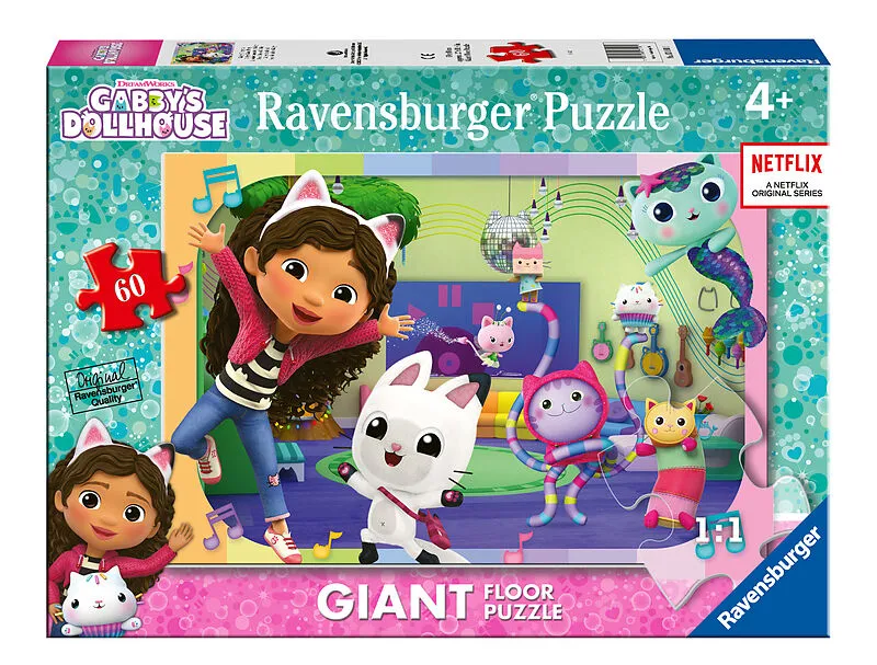 Ravensburger Giant Floor Puzzles - Puzzlespaß im Großformat! Aus 60 extra großen und stabilen Puzzleteilen entsteht ein tolles Motiv mit Gabby und ihren Freunden aus der Kinderserie Gabby's Dollhouse im Format 69 x 49 cm. Stück für Stück können Kinder ab ...