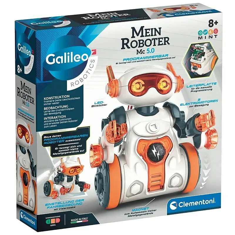 Clementoni Mein Roboter MC 5 Ein einzigartiger und origineller Roboter zum Zusammenbauen, mit vielen unterhaltsamen Spielmodi! Dank zweier Infrarotsensoren kann der neue Roboter Hindernissen ausweichen und deiner Hand wie ein echter Bluthund folgen. Du kannst ...