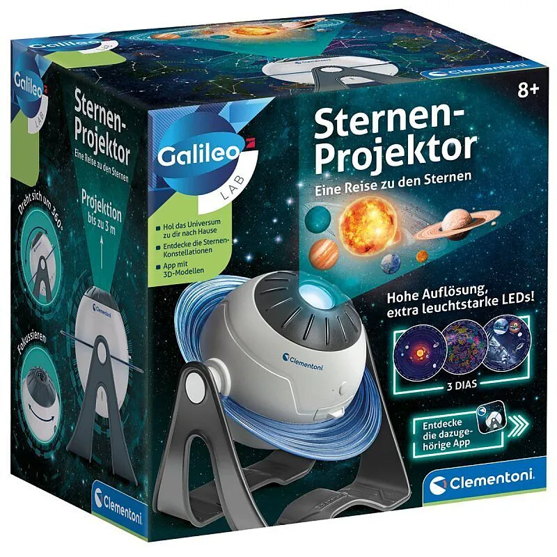 Galileo Sternen-Projektor Ein Planetarium zur Beobachtung der Planeten, Sterne und Konstellationen, die direkt an die Wand projiziert werden! Das Produkt enthält verschiedene Bilder, die projiziert werden können. Mit der App kann man auf Quizfragen zugreifen, ...