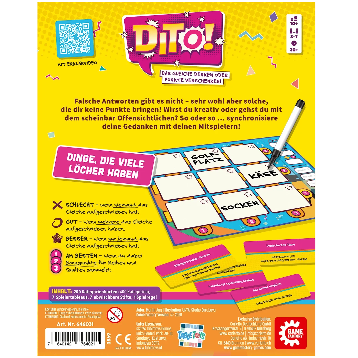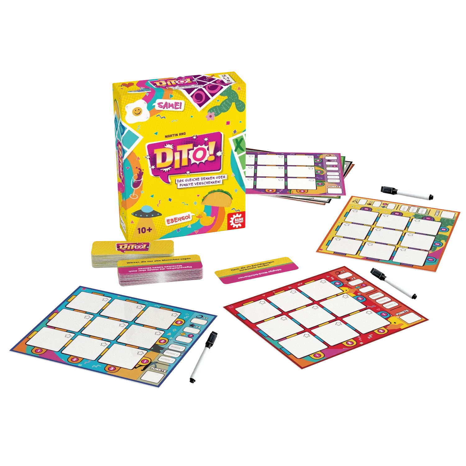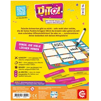 "Dinge, die in Paaren kommen", "Typisch Deutschland" und Filme, die einen zum Weinen bringen". Falsche Antworten gibt es in Dito nicht sehr wohl aber solche, die dir keine Punkte bringen, weil kein Mitspieler das Gleiche notiert hat. Wirst du also kreativ oder...