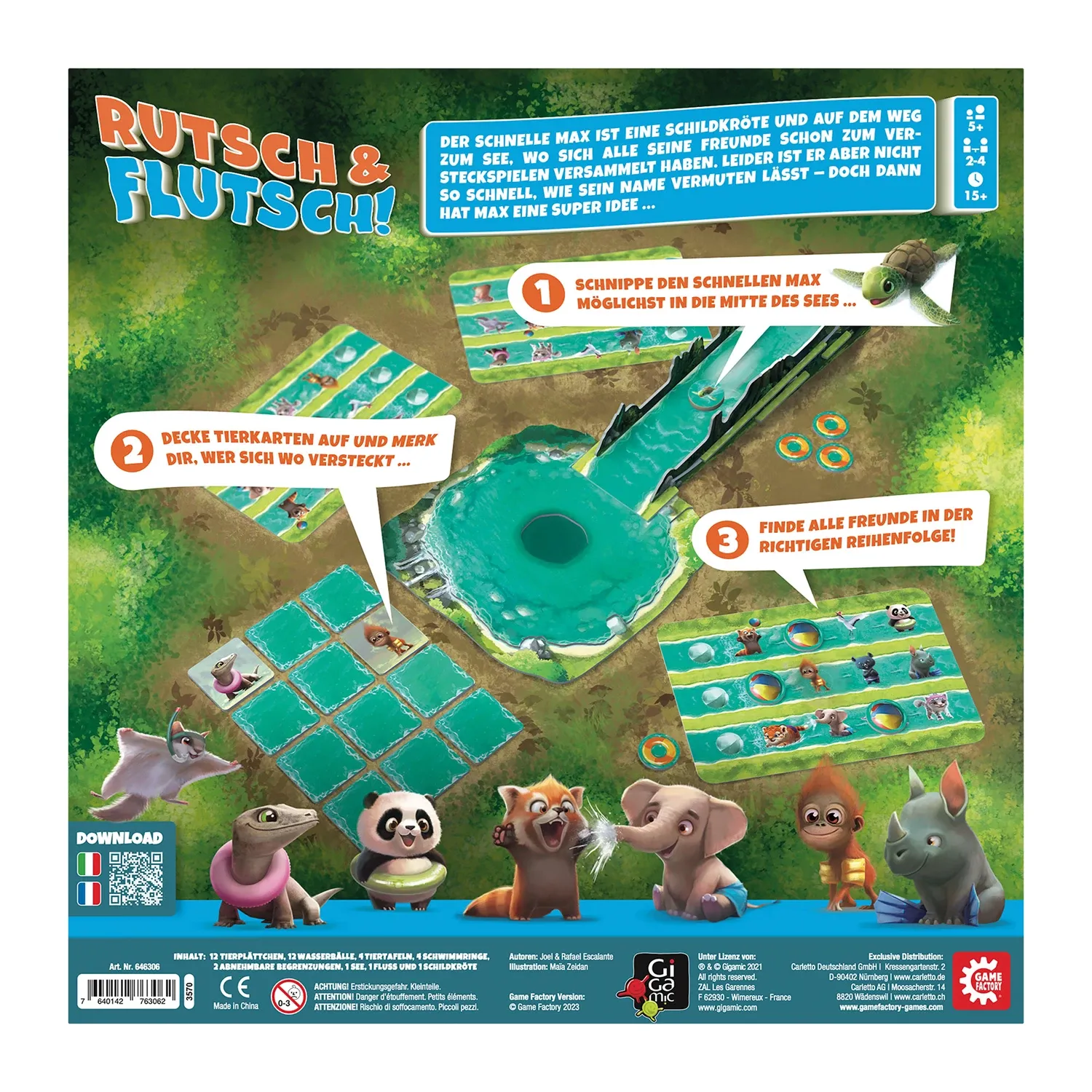Das kurzweilige Kinderspiel Rutsch & Flutsch ist ein spannender Mix aus Action- und Memospiel. Kinder ab 5 Jahren versuchen die Schildkröte möglichst in die Mitte des Sees zu schnippen. Je besser geschnippt wird, desto mehr Tierplättchen dürfen umgedreht werde...