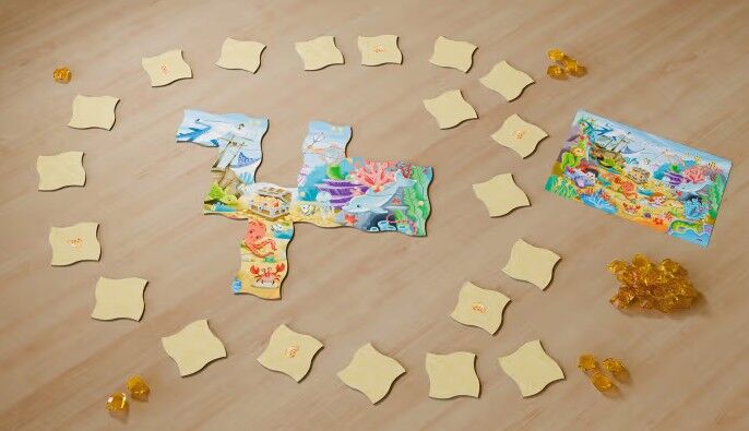 Tief im Ozean liegt ein altes Wrack auf dem Meeresgrund. Das Schiff war beladen mit einer Truhe voll Gold, Schmuck und Edelsteinen. Lust auf eine Schatzsuche? Dann los: Kinder decken abwechselnd Puzzleplättchen auf und legen sie, wenn möglich, an. Dabei können...