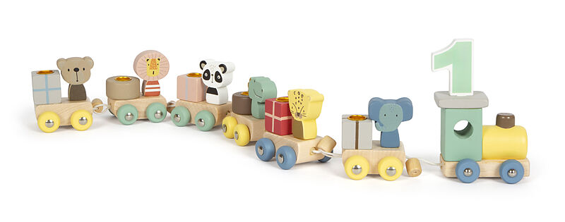 Der tierische Geburtstagszug rollt heran! Mit seinen bunten Waggons, Zahlensteckern von 1 bis 9 und niedlichen Tierfiguren bringt dieser dekorative Holz-Zug fröhliche Geburtstagsstimmung auf jeden Tisch. Ob als Highlight auf der Geburtstagstafel oder als origi...