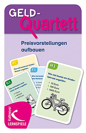 Preisvorstellungen aufbauenWas kostet ein Bleistift oder ein Tischtennisball? Ist ein T-Shirt für 50 Euro ein Schnäppchen? Und wie viel hat Mama wohl für mein neues Fahrrad bezahlt? Beim Spielen des Geld-Quartetts entwickeln die Kinder Vorstellungen von Preise...