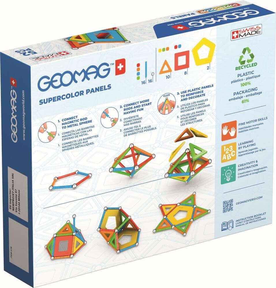 Geomag Supercolor Panels Recycled 52 Stück Geomag-Magnetspielzeuge unterstützen die gesunde Entwicklung von Kindern und den Erhalt einer lebenswerten Umwelt, in der unsere Kinder aufwachsen. Das Spielen mit Geomag verbessert Feinmotorik, Hand-Augen-Koordinatio...
