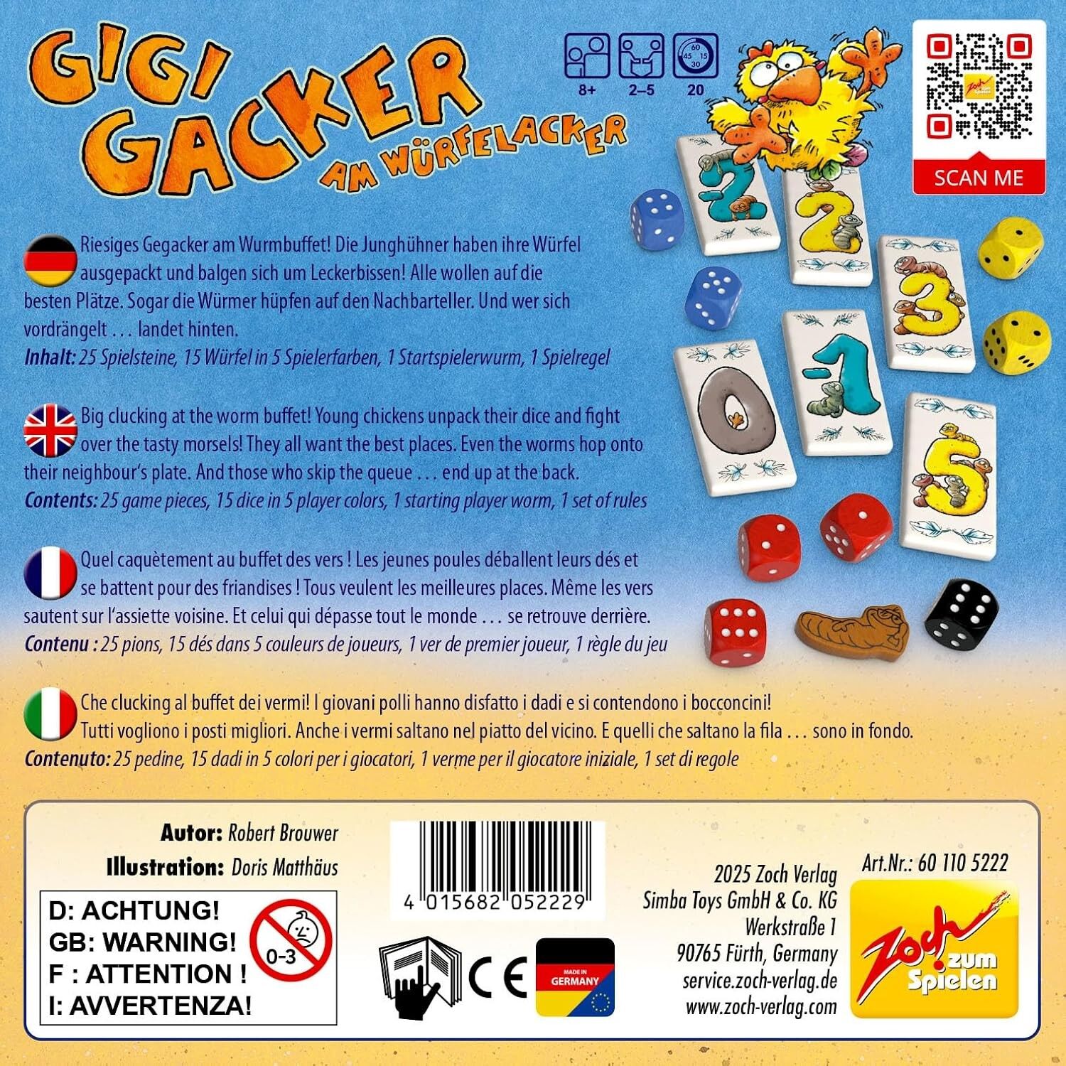 Am Würfelacker ist ordentlich was los: Hungrige Hühner kämpfen um die saftigsten Wurmhäppchen - aber hier wird nicht nur gewürfelt, sondern auch geschubst und getrickst! Jede Runde werden saftige Würmer ausgelegt, die sich in Größe und Schmackhaftigkeit unters...