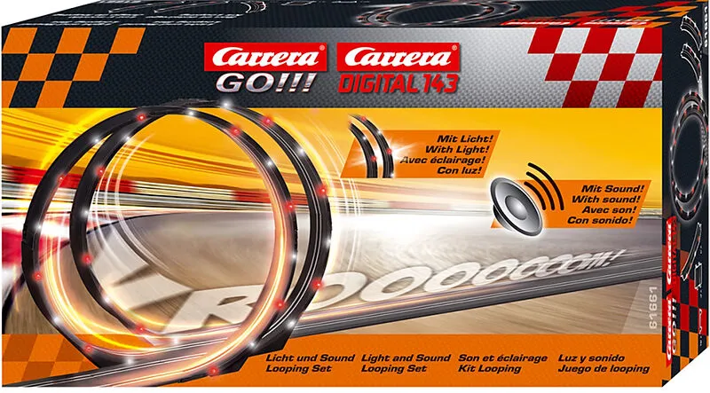 Das LED Looping Set mit Motorengeräuschen und blinkenden LED-Lämpchen sorgt für noch mehr Action und eine tolle Ambiance auf der Rennstrecke. Inhalt: 8 Loopingteile, 3 Geraden 11.4 cm.ACHTUNG! Dieser Artikel darf nicht mit Digital 143 System verwendet werden.