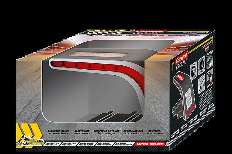 Elektronischer Rundenzähler für GO!!! und GO Plus für den 2-spurigen, analogen Spielbetrieb, mit einer 114 mm-Geraden als Ausgleichsstück. Die Zeitmessung erfolgt in 1/1000-Sekunden. Fahrzeugerkennung mittels Infrarot-Lichtschranken. Es können Zeitrennen (1 s ...