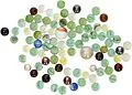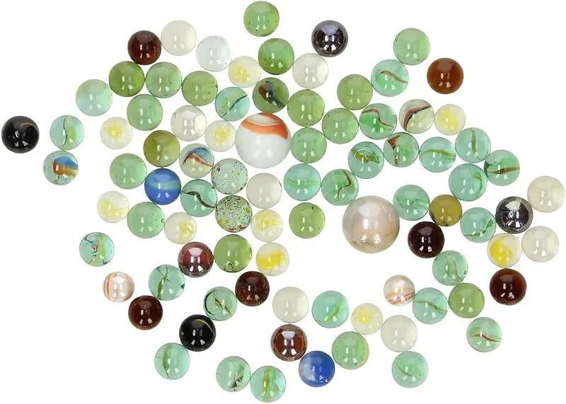 88 bunte Glasmurmeln in verschiedenen Farben im Netz verpackt zum Sammeln und Bespielen.