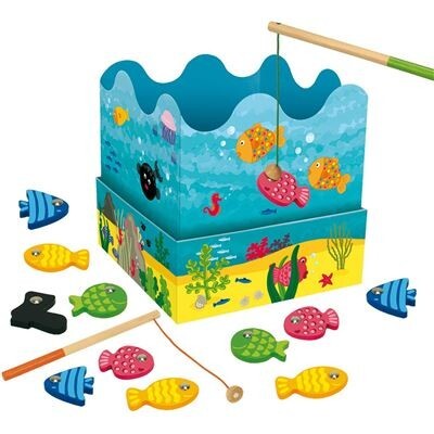 Mit der magnetischen Angel die Fische aus dem Teich zu holen, ist das Ziel und eigentlich ganz leicht. Doch hängt plötzlich der Stiefel am Angelhaken, müssen alle Fische wieder in den Teich zurückgeworfen werden. Die Angel und die Fische sind aus Holz, die Spi...
