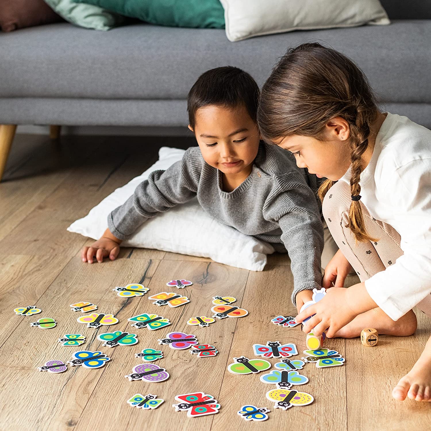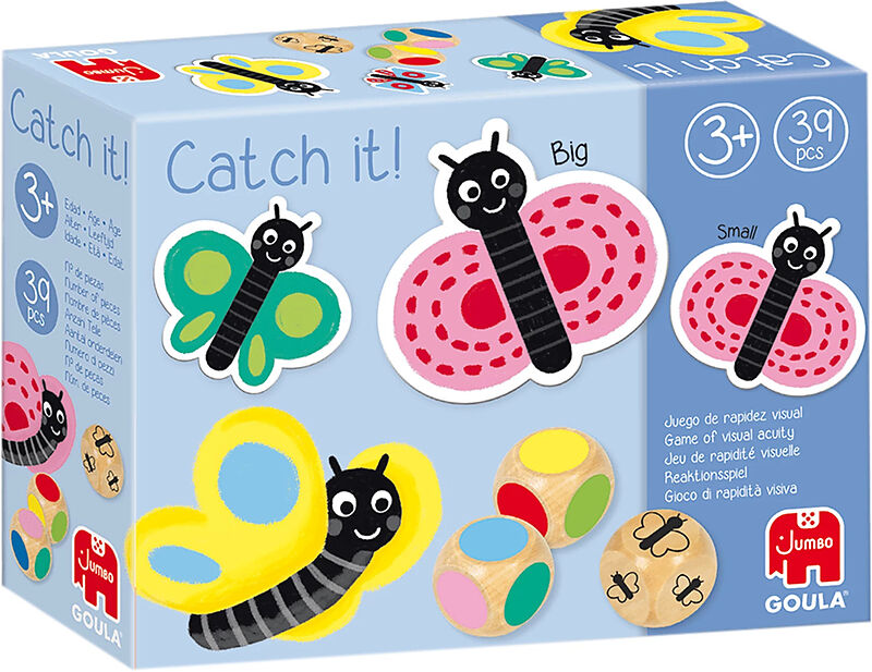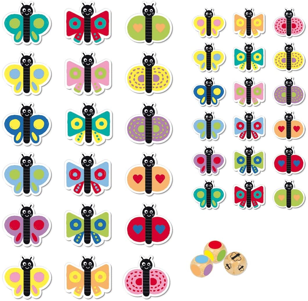 Reaktionsspiel mit einfachen Regeln. Schmetterlinge suchen und fangen. Würfelspiel. Vorschulspiel mit visueller Geschwindigkeit: Die Figuren werden auf den Tisch gelegt und die 3 Würfel werden abwechselnd geworfen. Du musst die Kombination finden: Grösse des S...