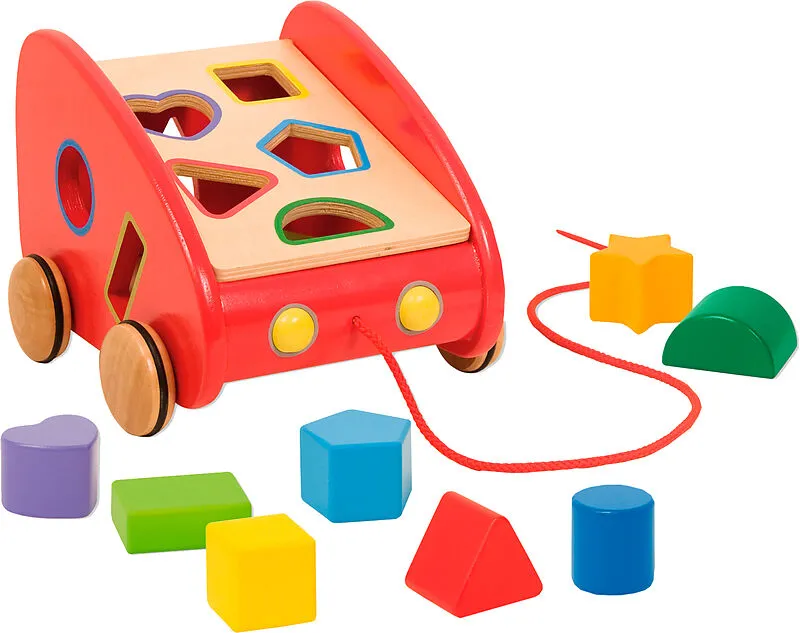 Nachziehwagen mit 9 Formen in verschiedenen Farben zum Zuordnen.