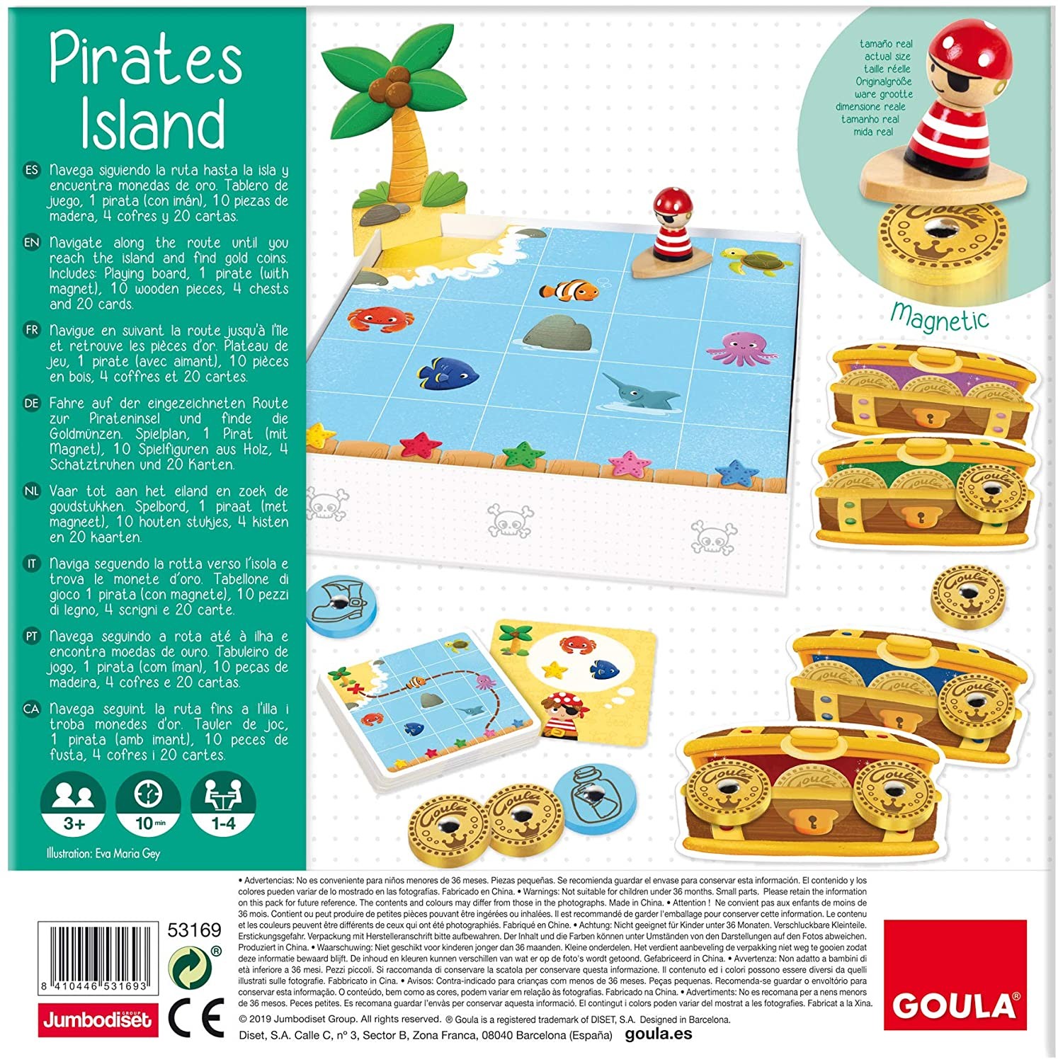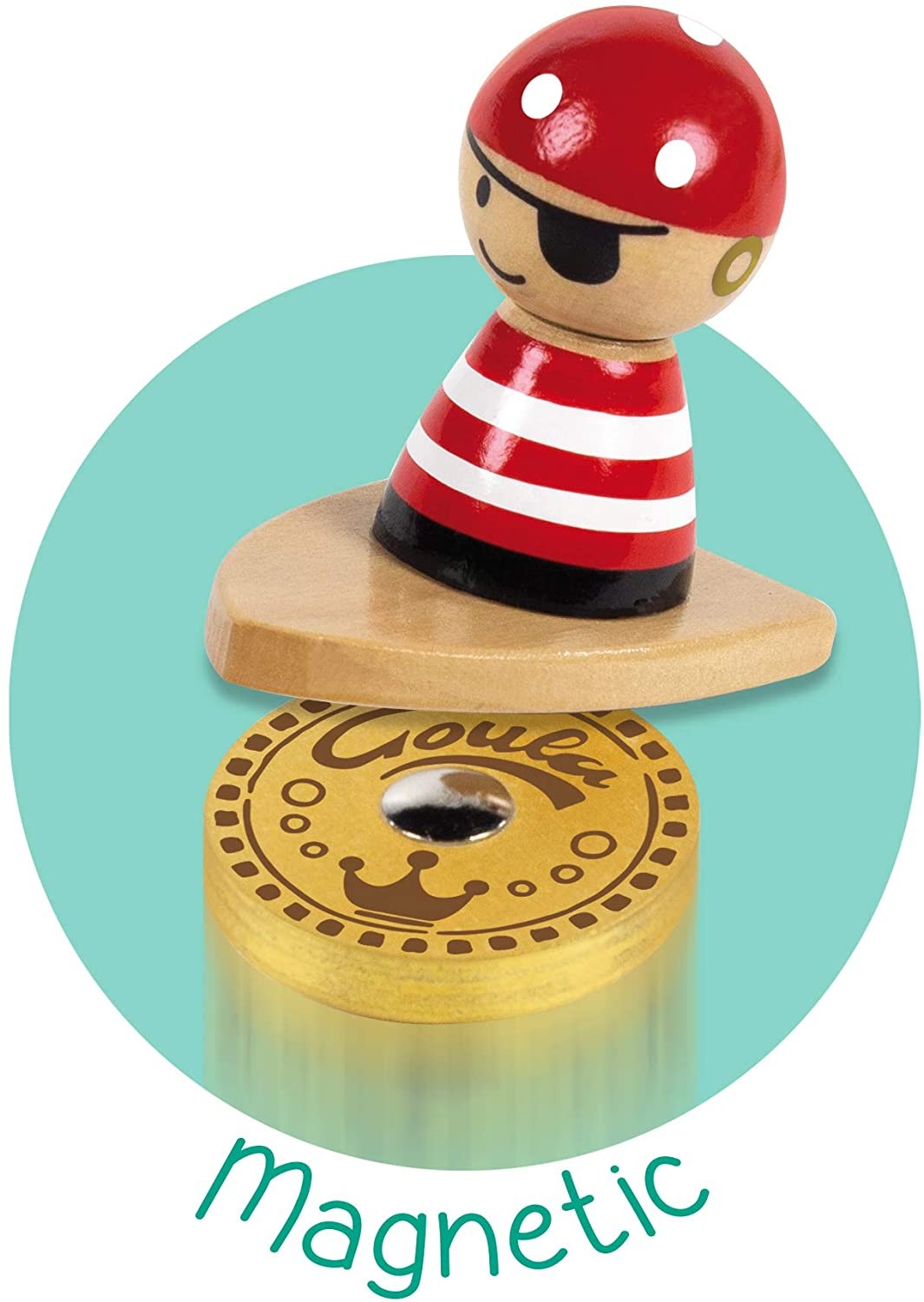 Segeln Sie entlang der Route zur Insel und finden Sie Goldmünzen. Spielplan, 1 Pirat (mit Magnet), 10 Holzstücke, 4 Truhen und 20 Karten. Arrarrarr! Bei diesem Spiel von Goua sind kleine Piratinnen und Piraten gefragt. Mit dem Boot geht es auf große Schatzsuch...